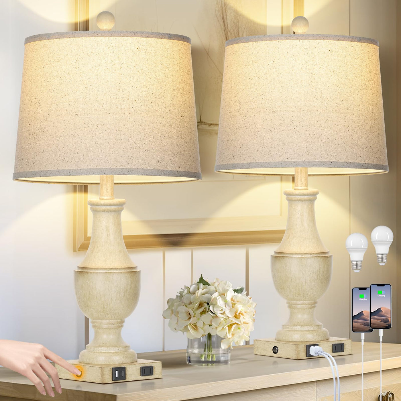 Rinweey Farmhouse Lamps Set Of 2, Vintage Rustic 3-Way Dimmable Touch Control Table Lamp With Usb A+C Charging Ports & Ac Outlet