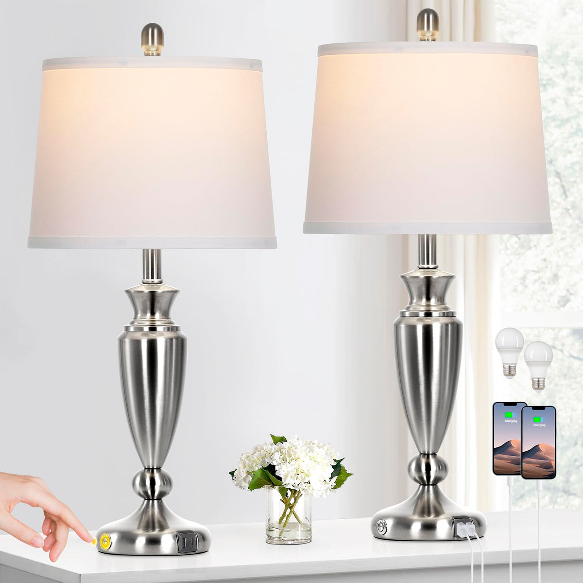Rinweey Metal Table Lamps Set Of 2, 3 Way Touch Control Silver Bedside Lamps With Usb A+C Ports, Modern Brushed Nickel Nightstan