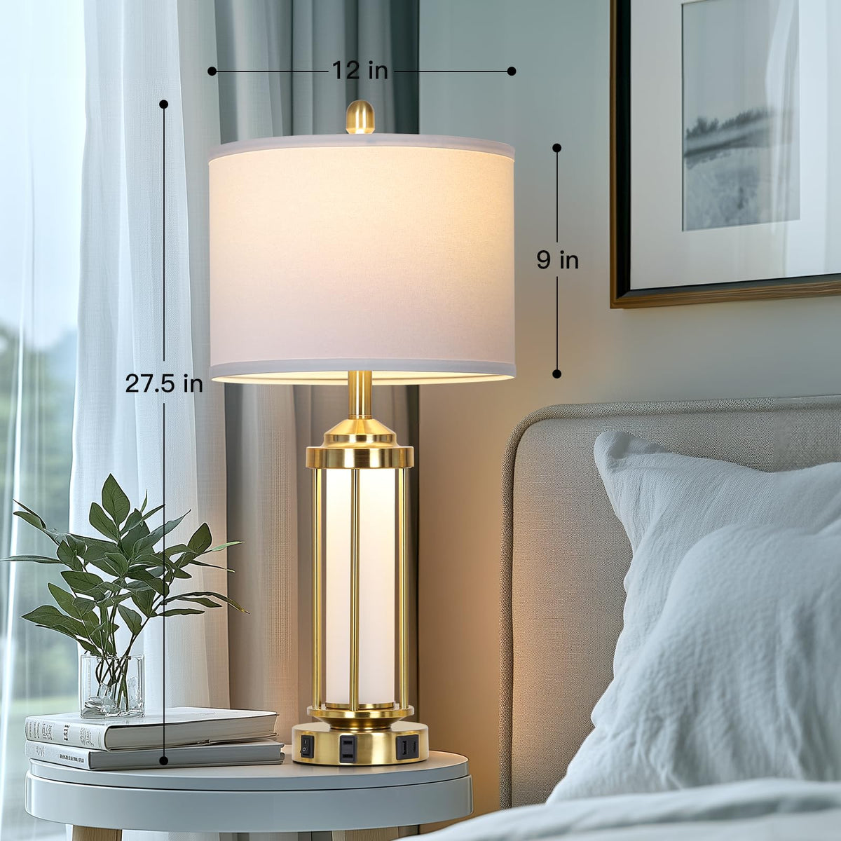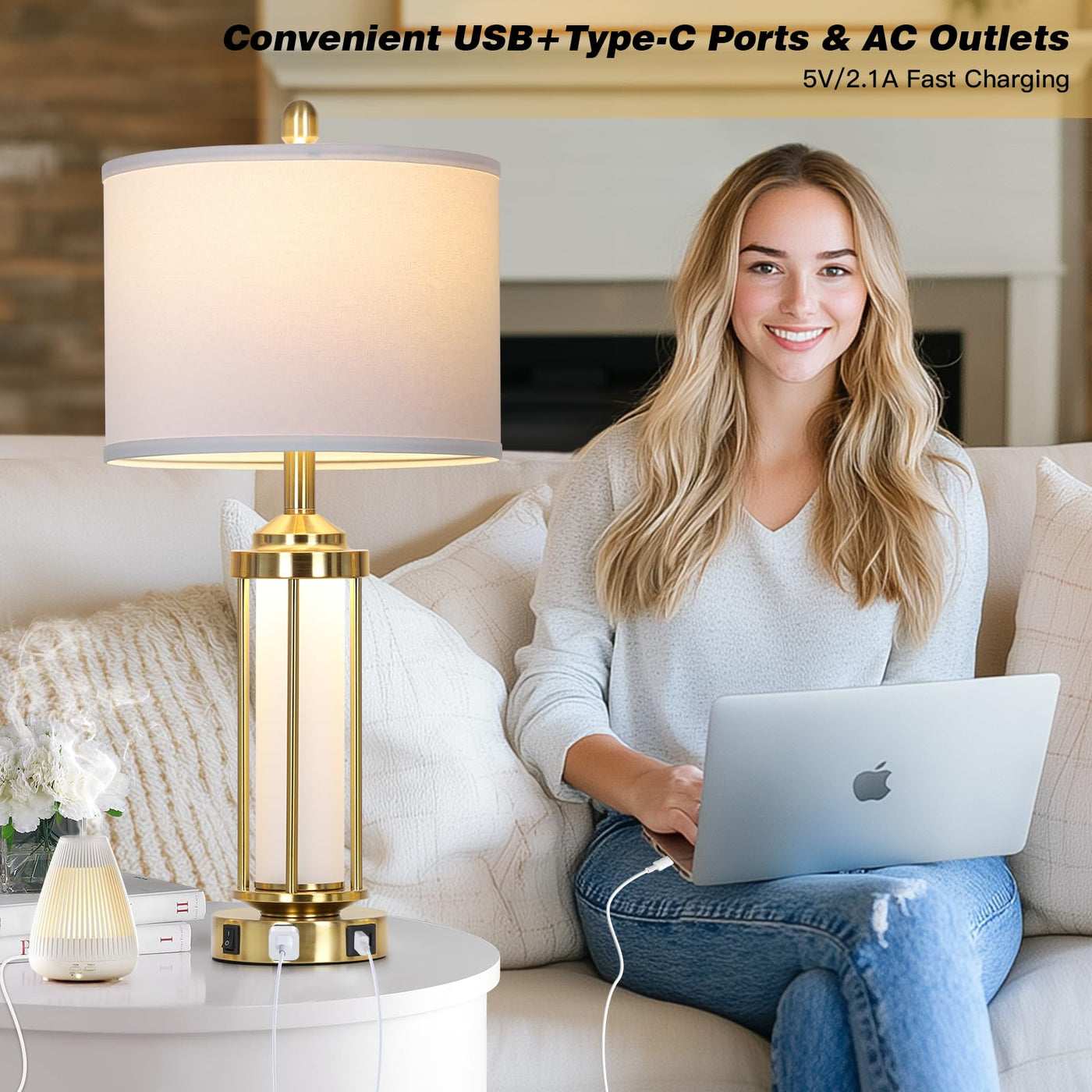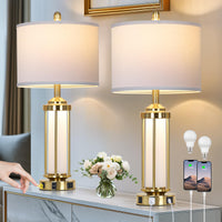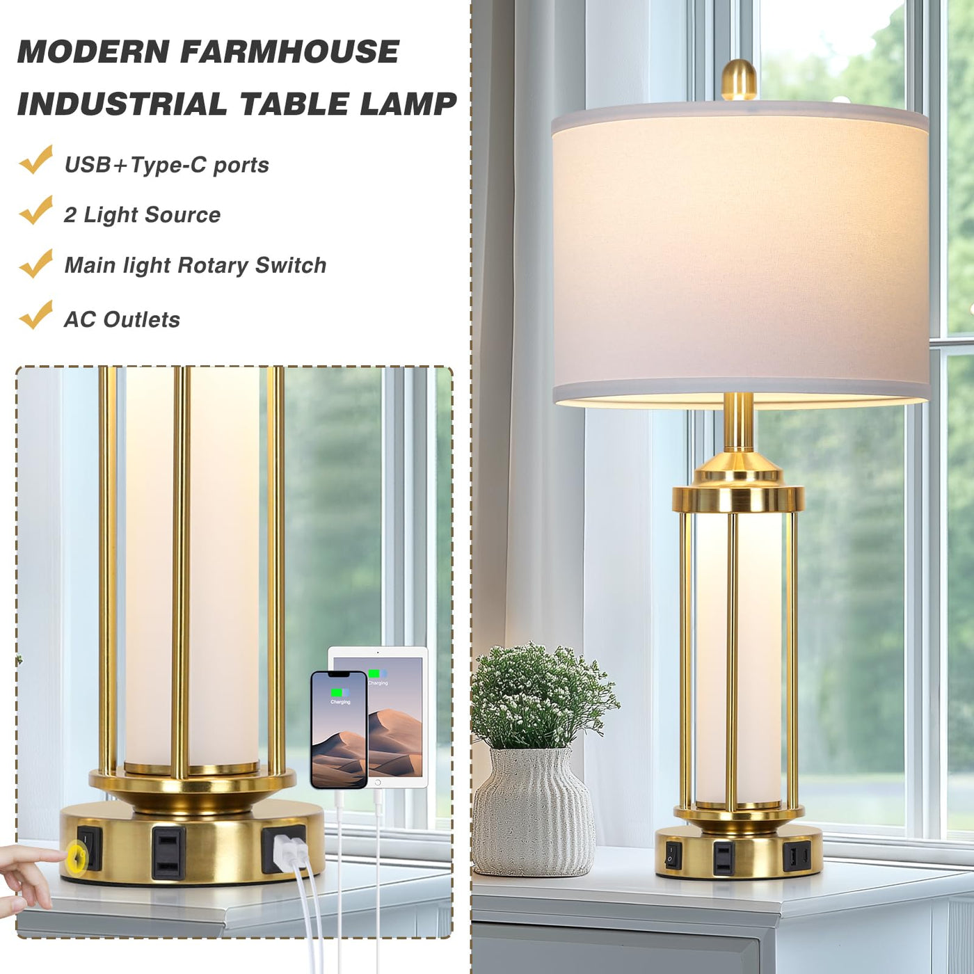 Rinweey Modern Table Lamps, Gold 27'' Industrial Table Lamp Set Of 2 With Usb A+C Charging Ports & Ac Outlet, Farmhouse Rustic B