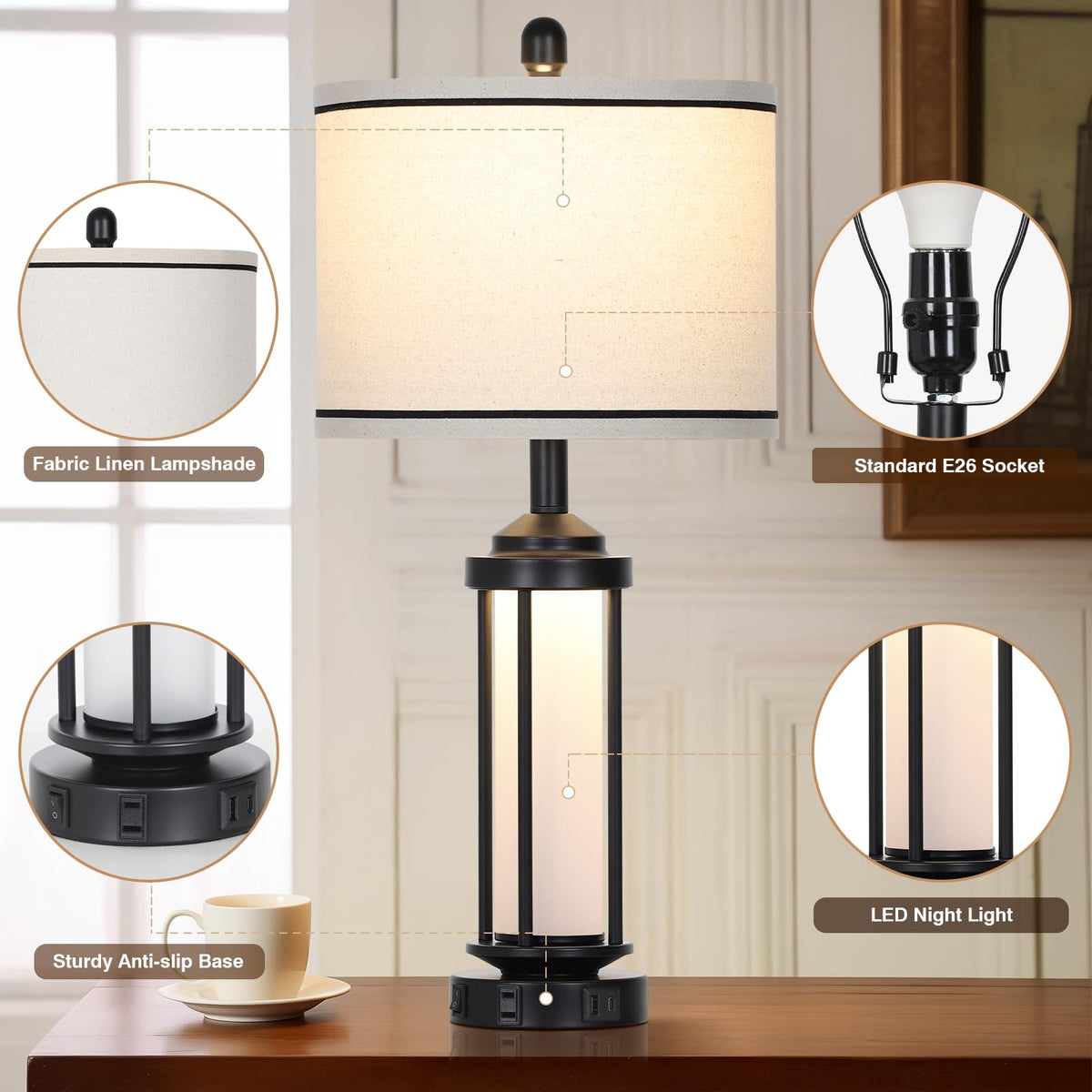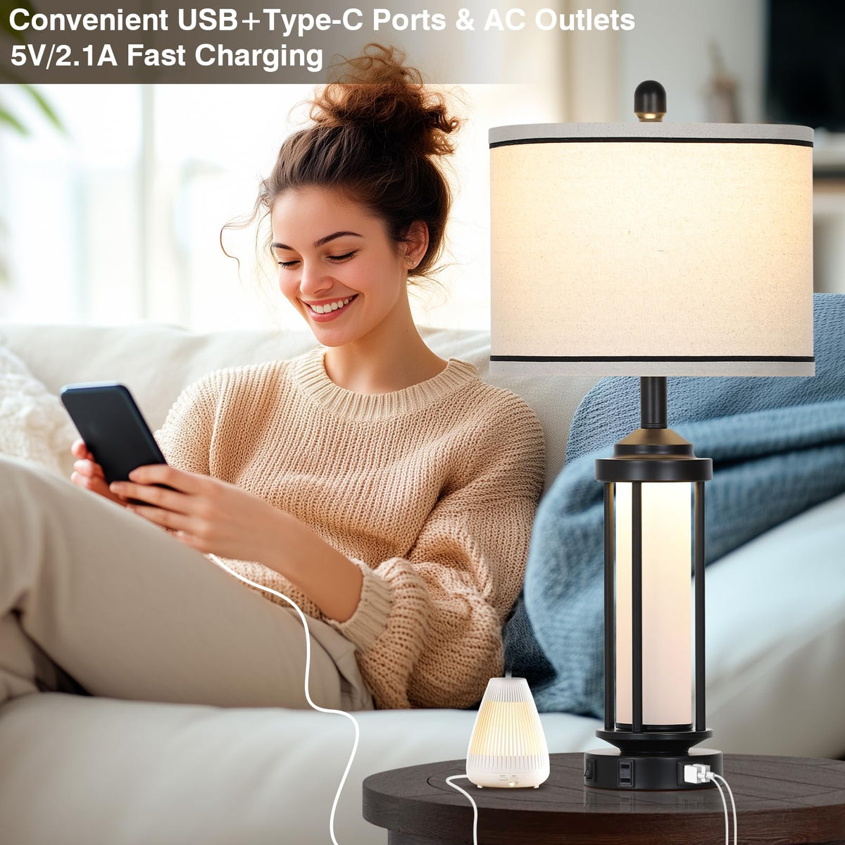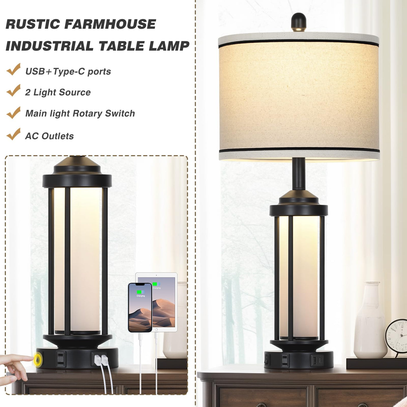 Rinweey Table Lamps For Living Room Set Of 2, Black Farmhouse Rustic Industrial Table Lamp With Usb A+C Charging Ports & Ac Outl