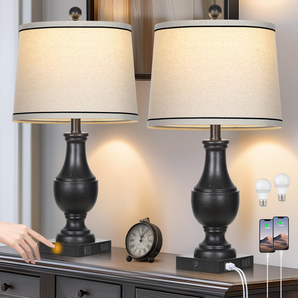 Rinweey Table Lamps For Living Room Set Of 2, Farmhouse Vintage Table Lamp With Usb A+C Charging Ports & Ac Outlet, 25'' Black R