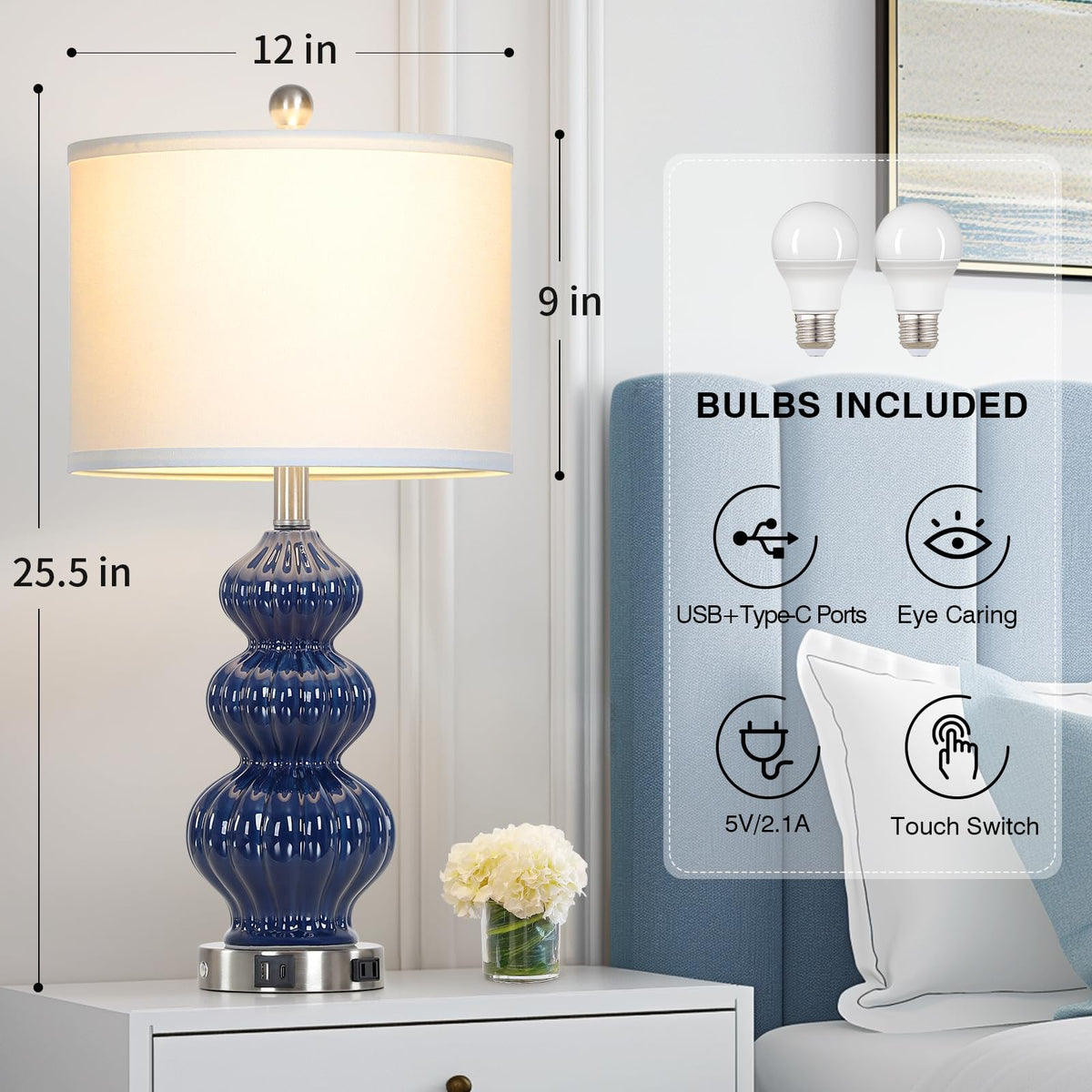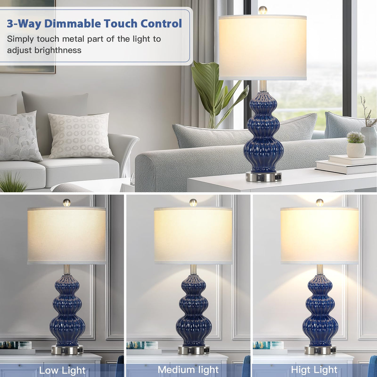 Rinweey Triple Gourd Ceramic Table Lamps Set Of 2, Modern Blue Bedside Lamps With Usb A+C Ports & Ac Outlet, 3 Way Touch Control Contemporary Nightstand Lamps For Bedroom Living Room