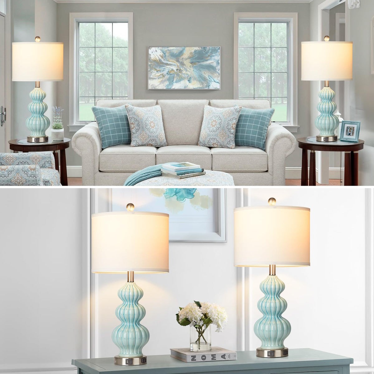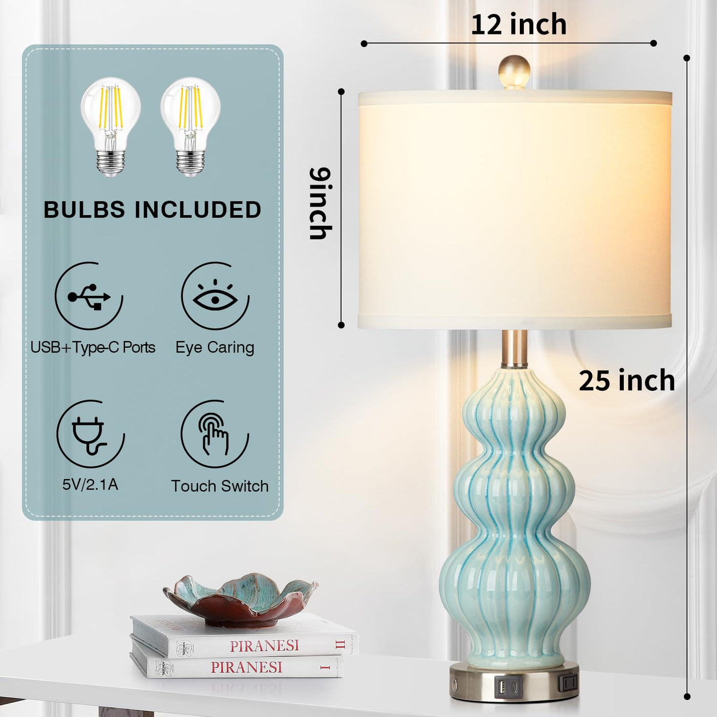 Rinweey Triple Gourd Ceramic Table Lamps Set Of 2, Modern Blue Bedside Lamps With Usb A+C Ports & Ac Outlet, 3 Way Touch Control Contemporary Nightstand Lamps For Bedroom Living Room (Bulb Included)