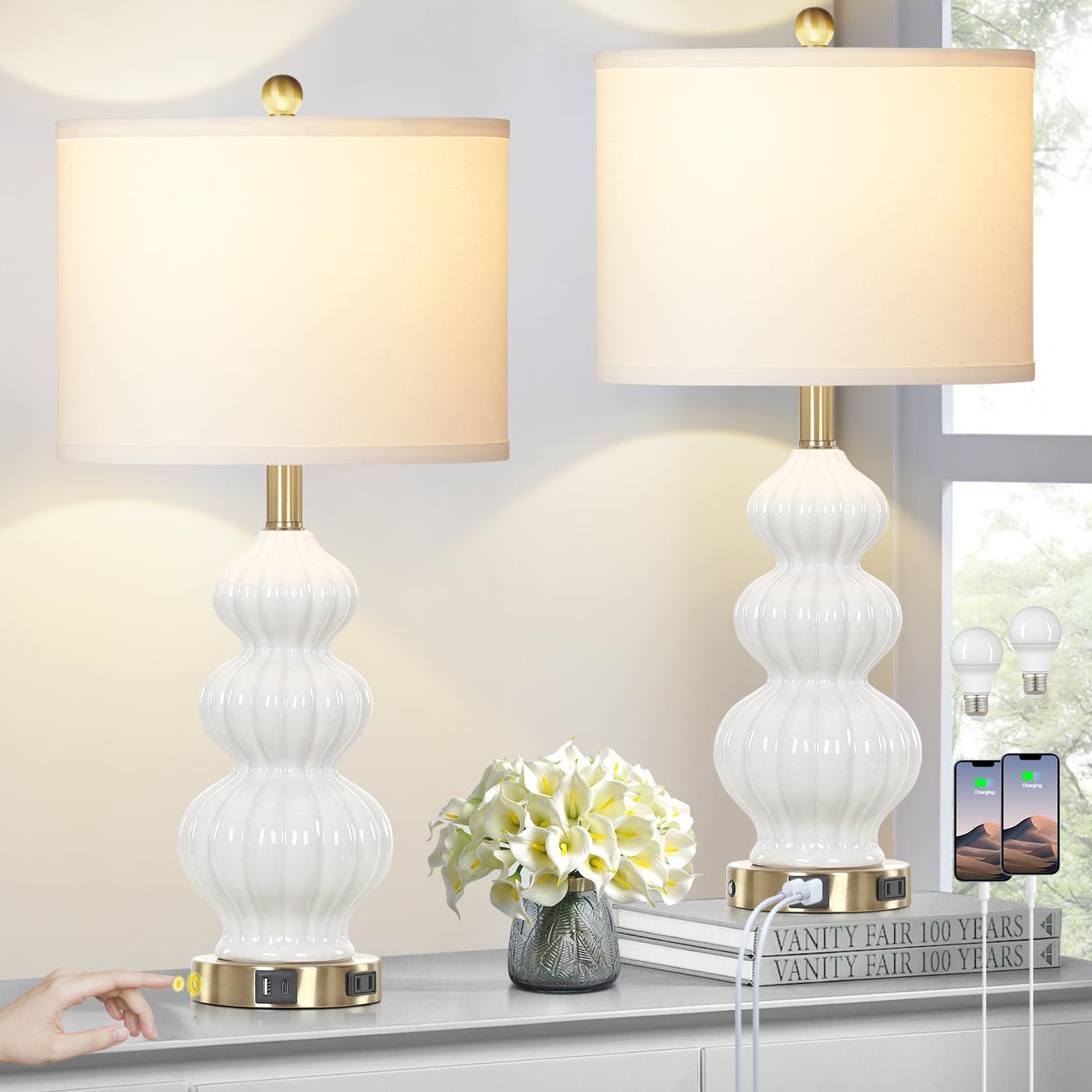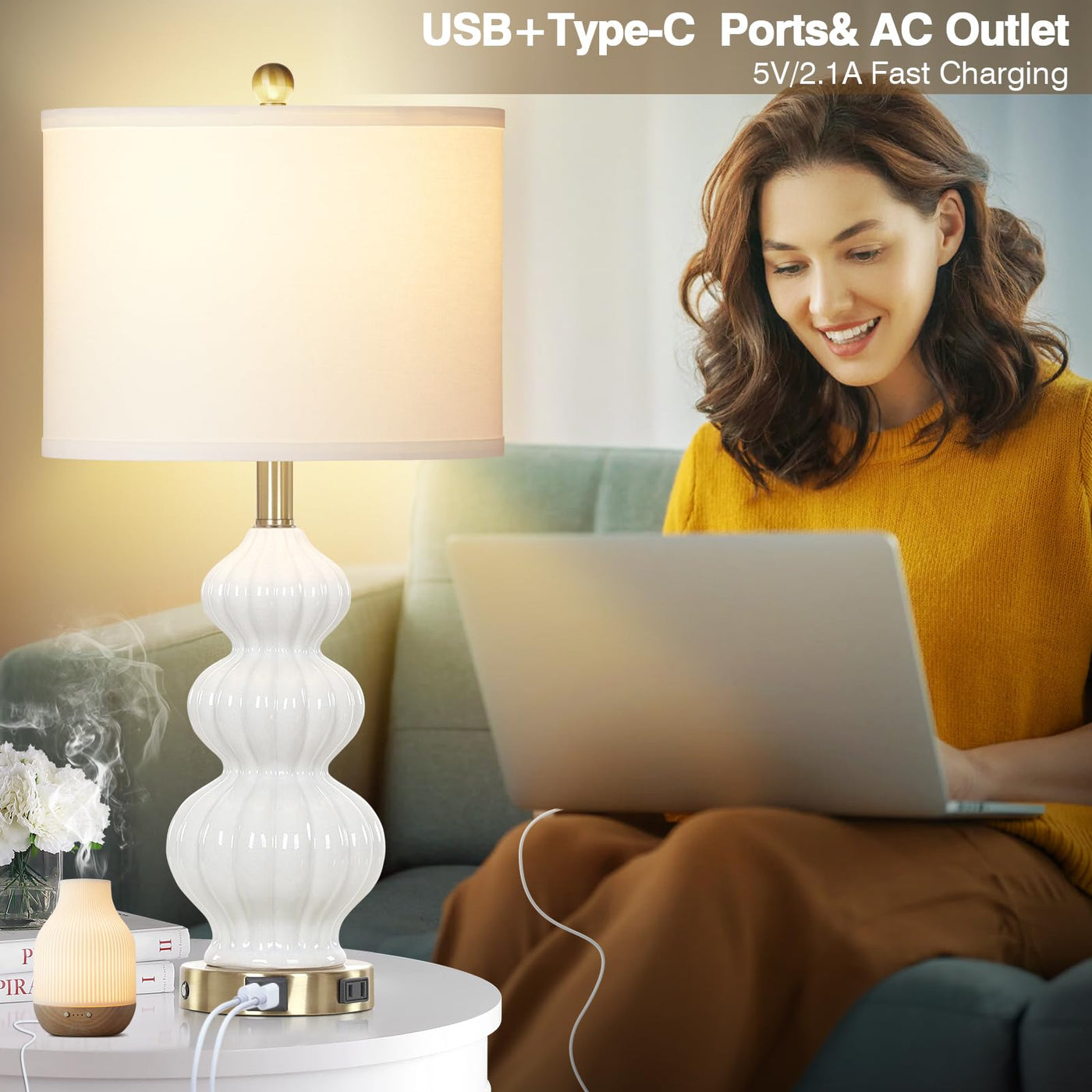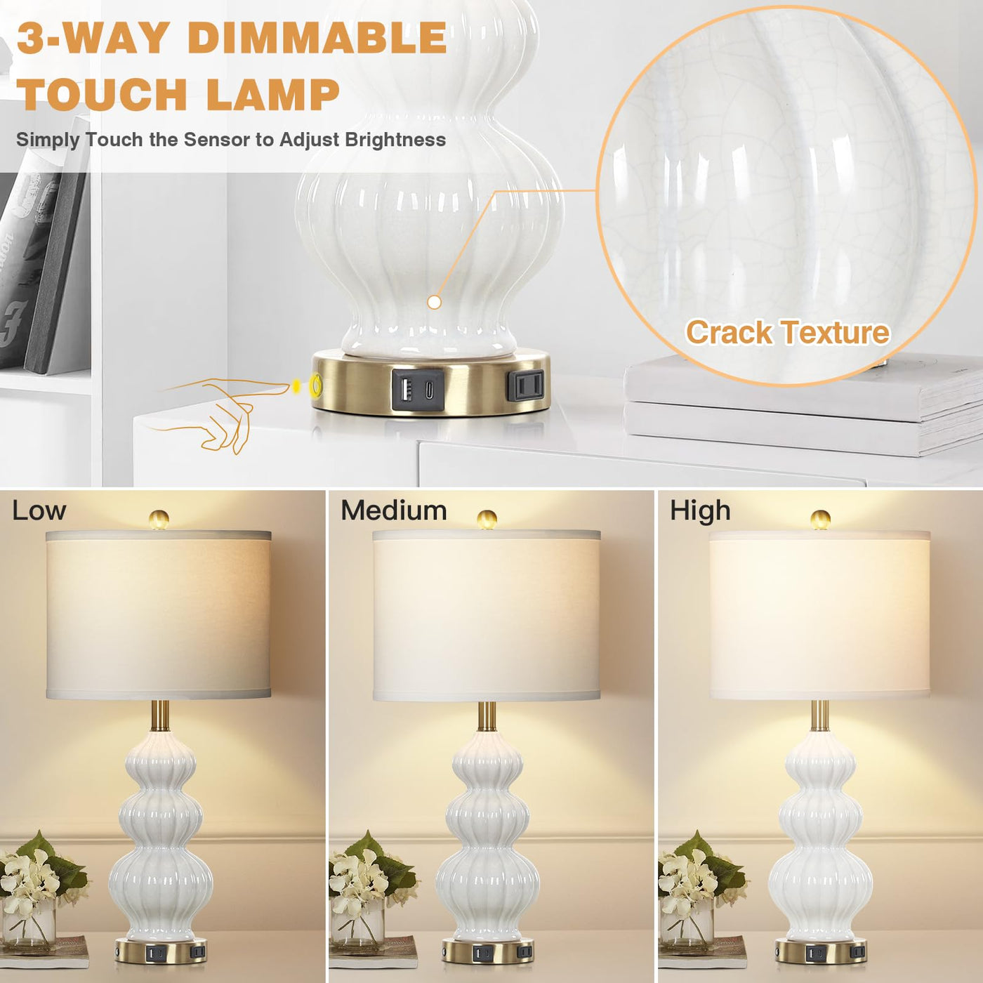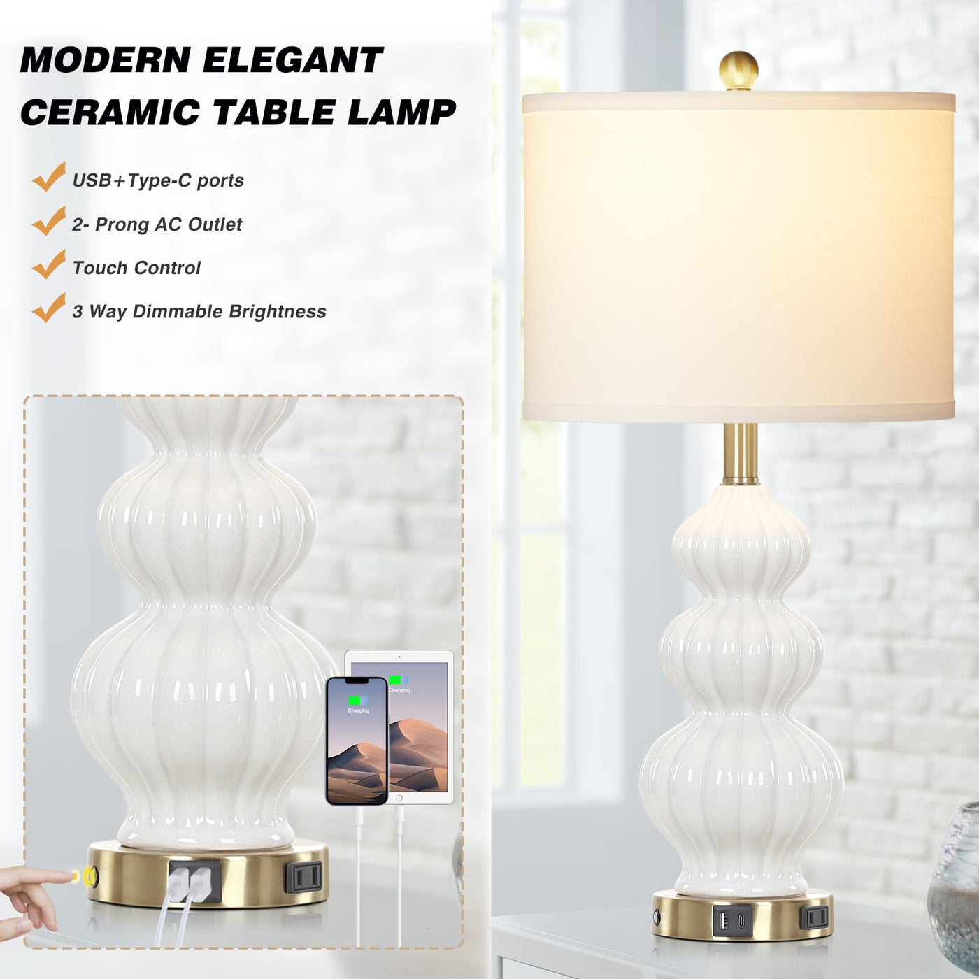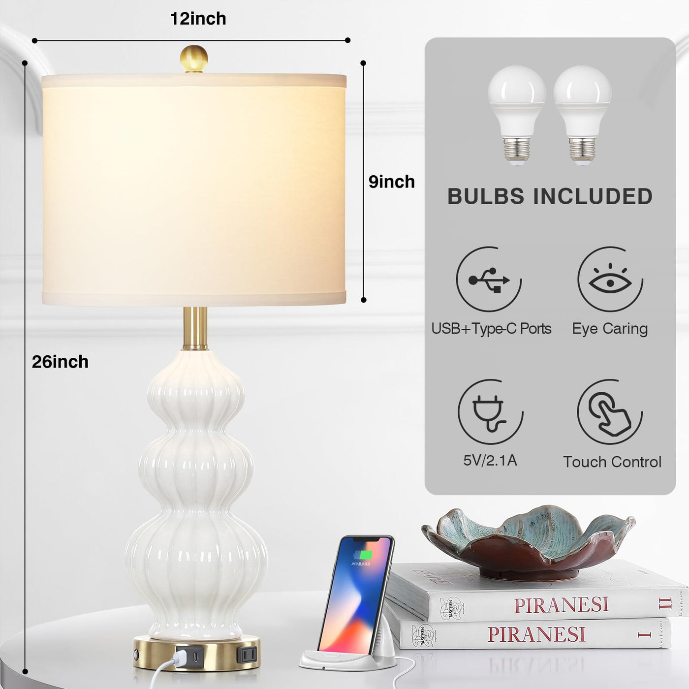 Rinweey Triple Gourd Ceramic Table Lamps Set Of 2, Modern White Bedside Lamps With Usb A+C Ports & Ac Outlet, 3 Way Touch Control Contemporary Nightstand Lamps For Bedroom Living Room