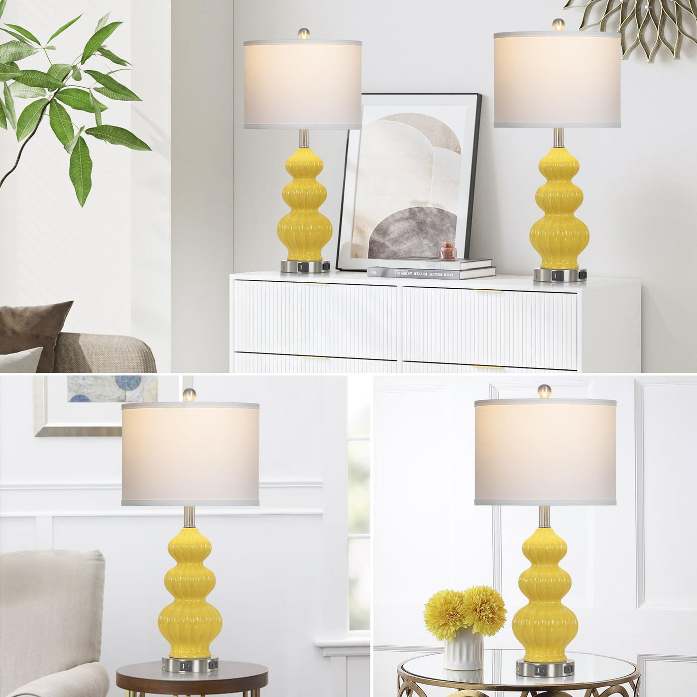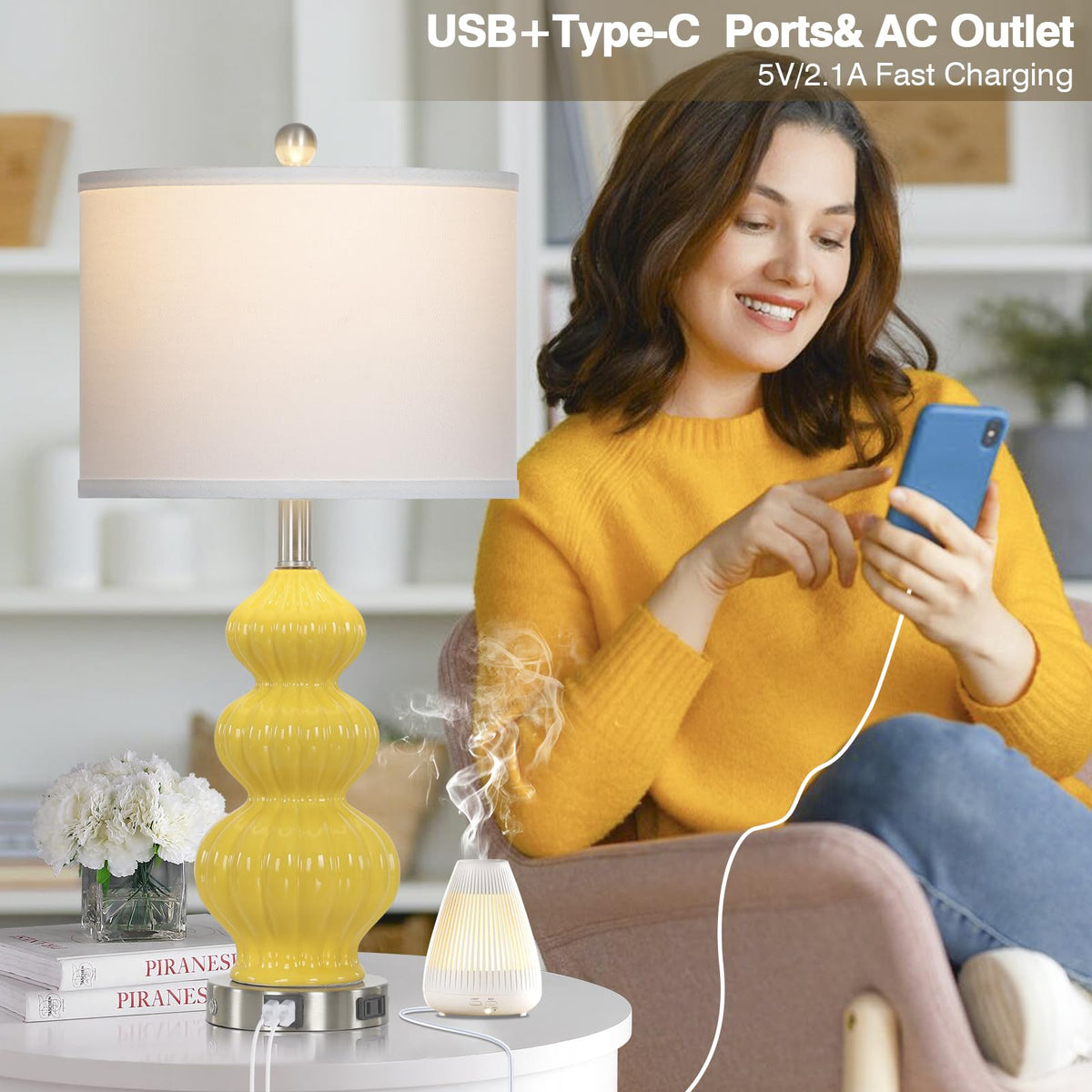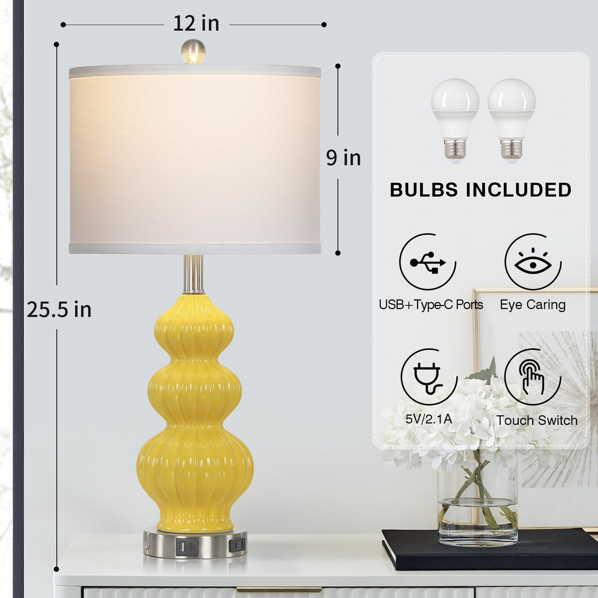 Rinweey Triple Gourd Ceramic Table Lamps Set Of 2, Modern Yellow Bedside Lamps With Usb A+C Ports & Ac Outlet, 3 Way Touch Control Contemporary Nightstand Lamps For Bedroom Living Room