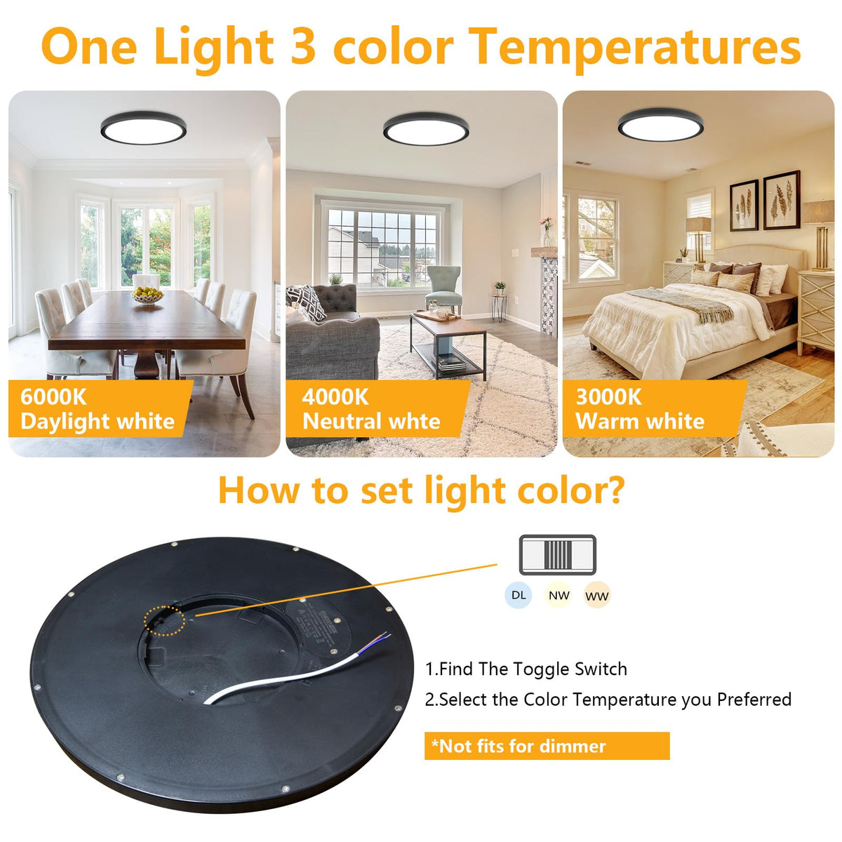Q: Is the color temperature adjustable?A: Yes, this ceiling light features three color temperature options: three thousand Kelvin (Warm White), four thousand Kelvin (Neutral White), and six thousand Kelvin (Daylight White), which can be easily selected using a switch on the back.