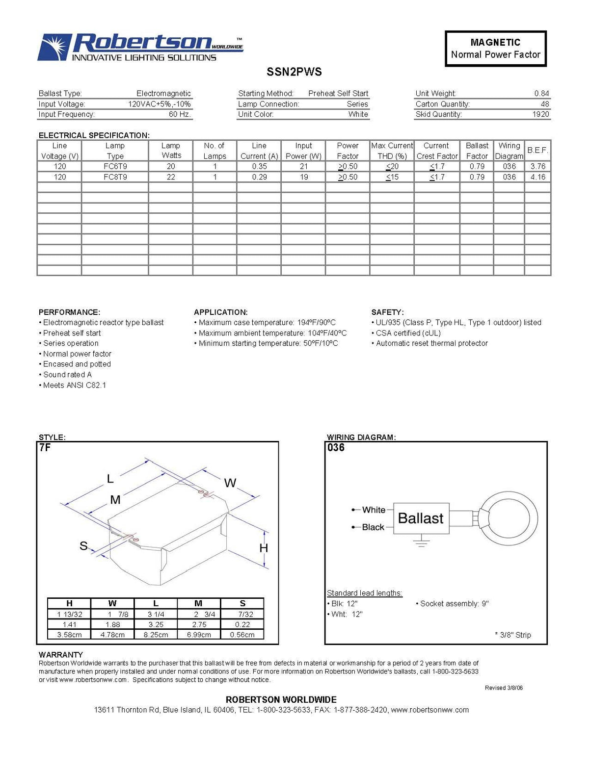 Robertson 3P10041 Individual Fluorescent Mballast, 1 Fc6T9 Or Fc8T9 Circline Lamp, Preheat Start, 120Vac, 60Hz, Normal Ballast Factor, Npf, Model Ssn2Pws /A