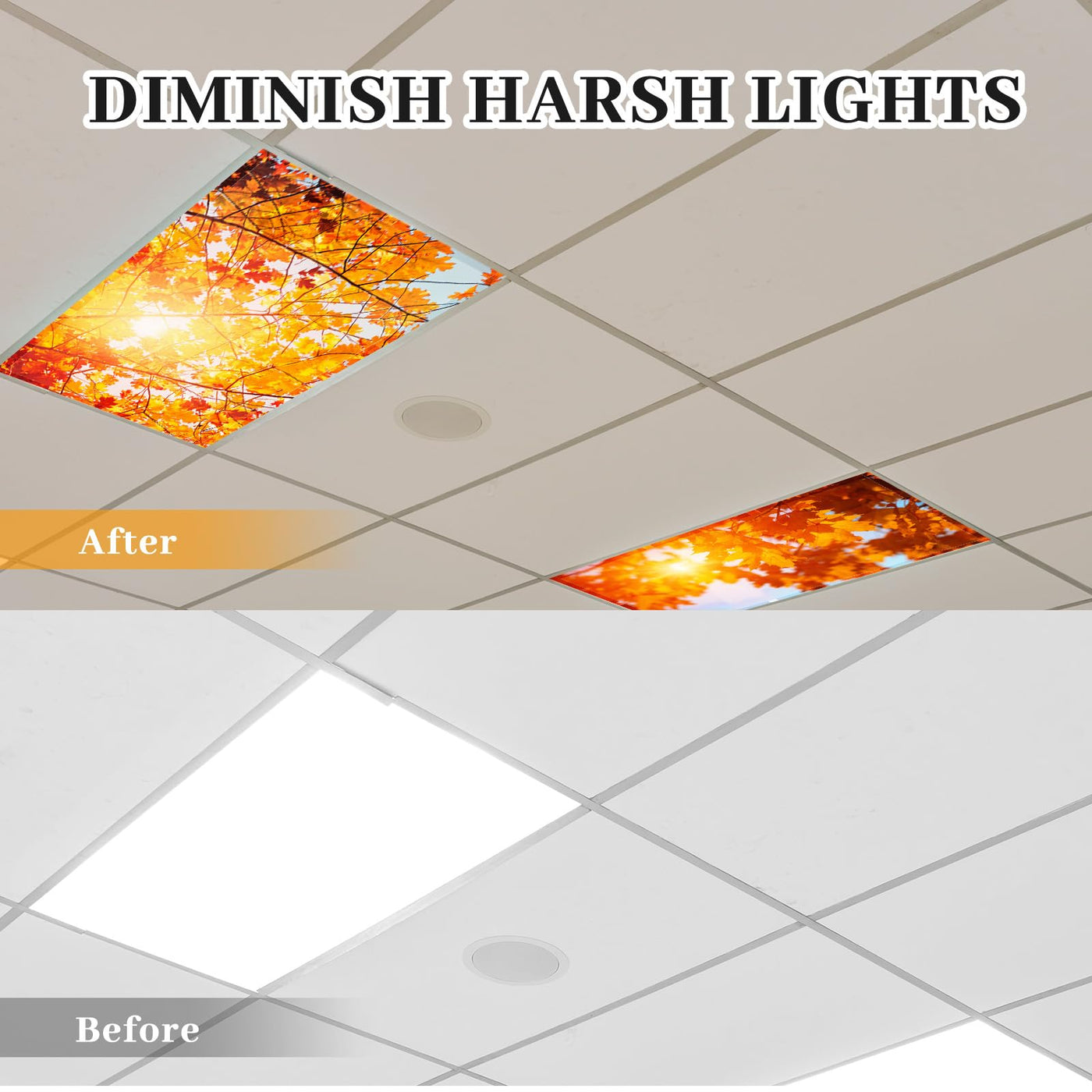 Q: How do these light covers help reduce glare?A: These magnetic light covers feature exquisite maple leaf patterns that effectively diffuse harsh light, helping to relieve eye strain and reduce glare caused by overly bright ceiling lights.