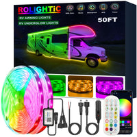 ROLiGHTiC 50FT RV Awning Lights Strip, 12V Multi-Color RV Underglow Led Lights, Camper Underbody Accent Lighting with APP RF Con