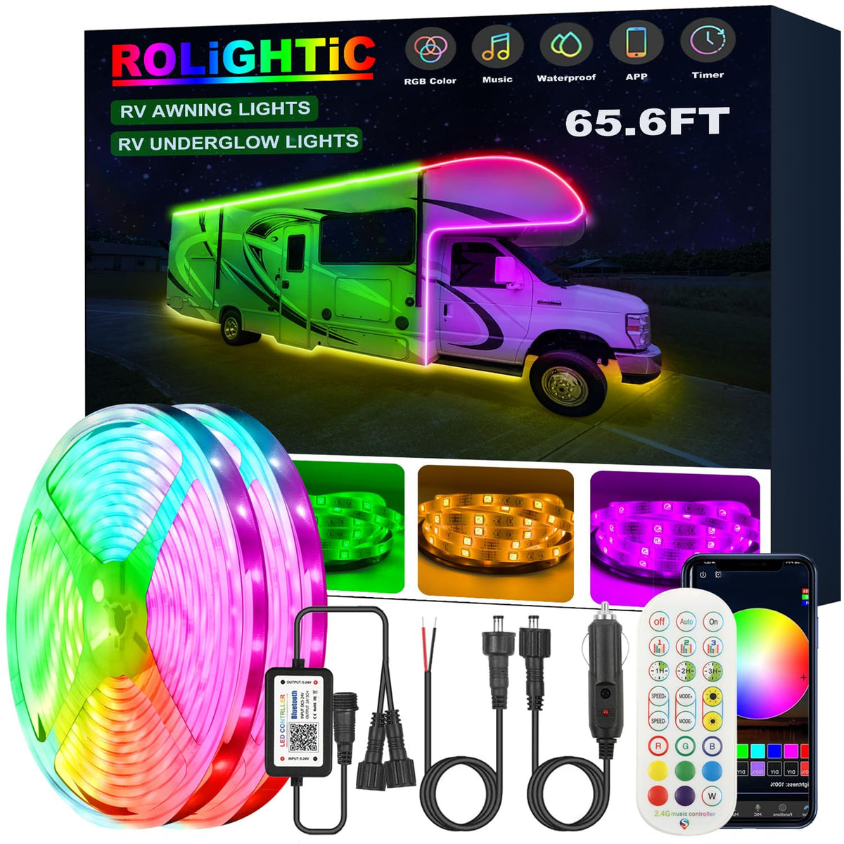 Rolightic 65.6Ft Rv Awning Lights Strip, 12V Multi-Color Rv Underglow Led Lights, Camper Underbody Accent Lighting With App Rf Control For Motorhome Travel Trailer Concession Stands Food Trucks