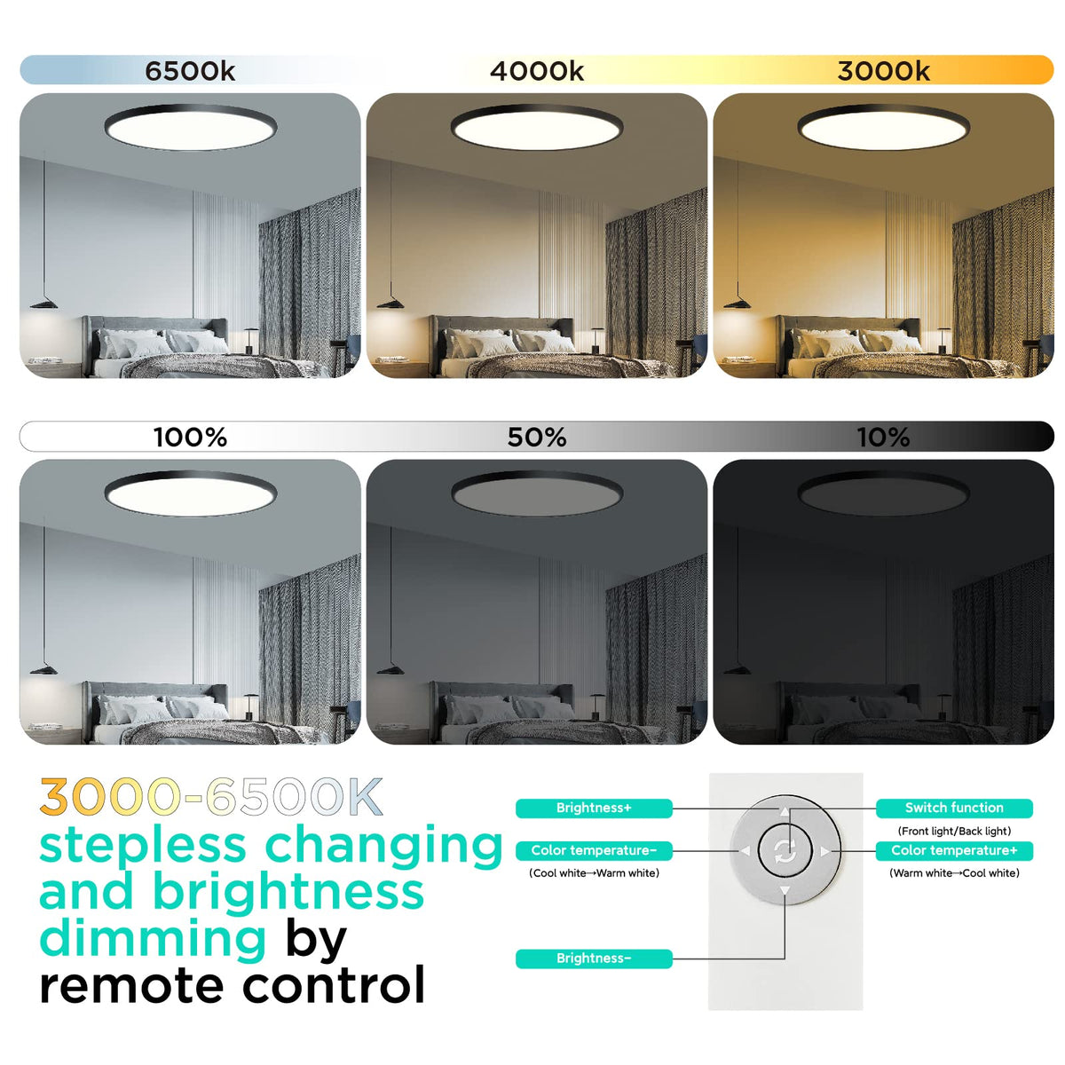 Q: How do I adjust the brightness and color temperature of this ceiling light?A: You can easily adjust the brightness and color temperature from warm to cool using the included remote control. The remote allows for smooth adjustments to suit your preference.