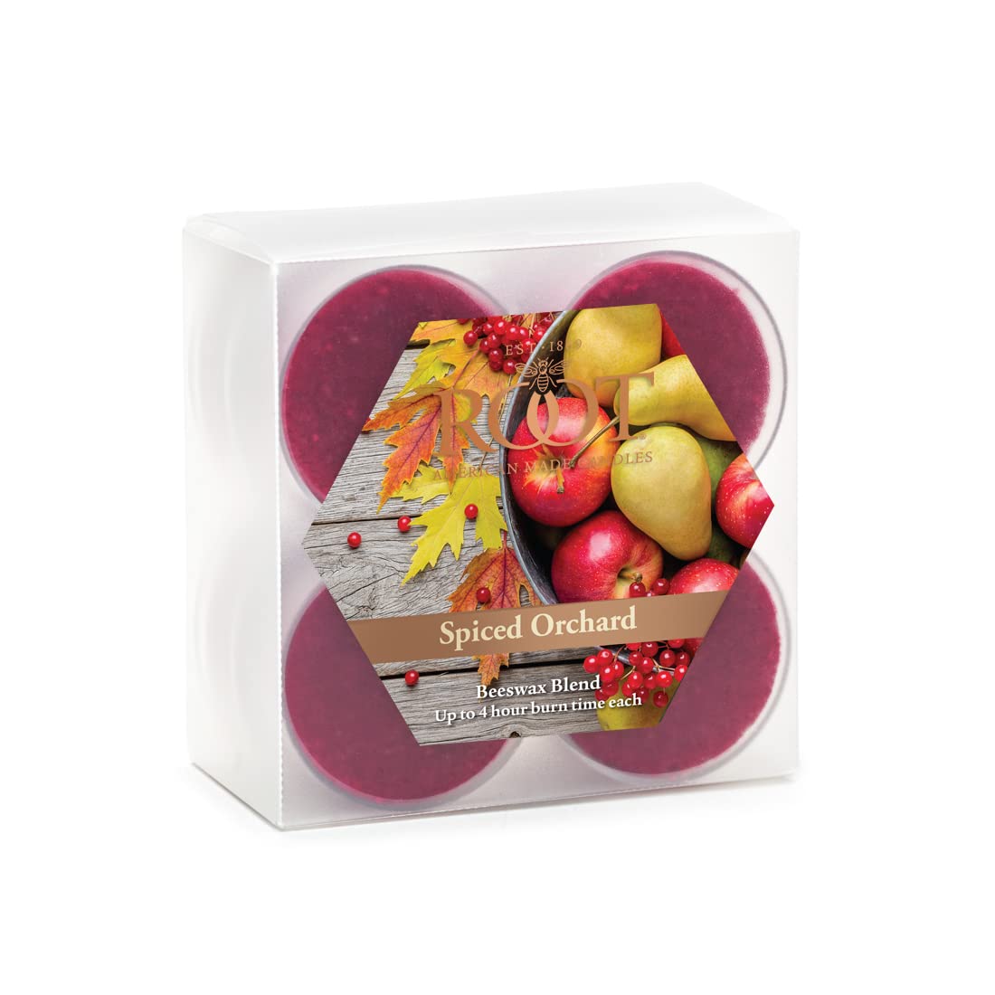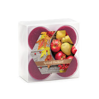 Q: What is the scent profile of the Spiced Orchard tealights?A: The Spiced Orchard tealights feature a fall-inspired fragrance with crisp pear and juicy apple notes, complemented by spicy cinnamon and creamy nutmeg.