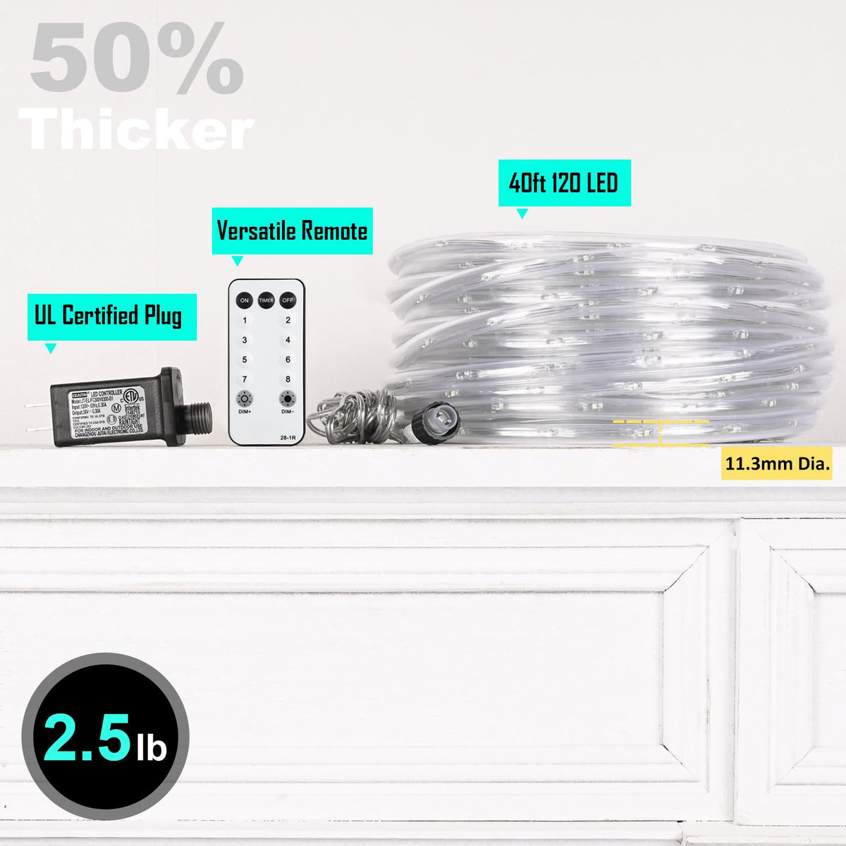 Rope Lights For Outside, 40Ft 120 Led Indoor/Outdoor Waterproof Rope Lights Plug In Waterproof Outdoor Tube Lights For Garden, Patio, Party, Christmas, Clear (Cool White)