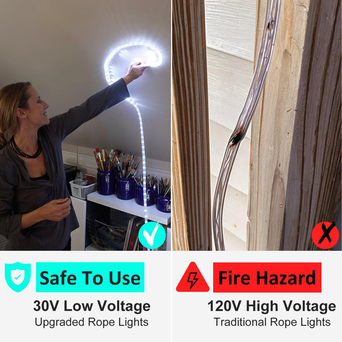 Q: What is the power source for these rope lights?A: The rope lights come with a power adapter that operates on 30V low voltage, making them safe for both indoor and outdoor use without overheating.