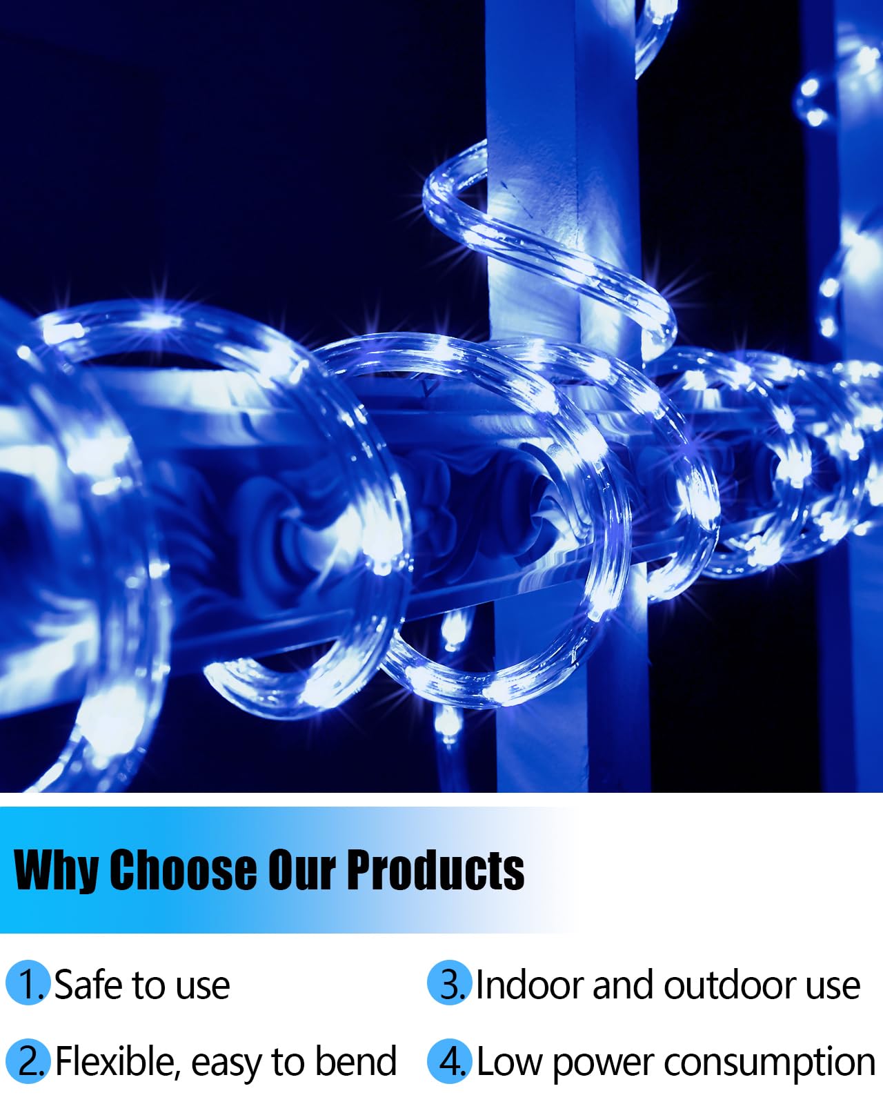 Q: What safety features do these Rope Lights include?A: These Rope Lights come with a UL-certified power supply and a built-in fuse surge protector, ensuring safe usage. It is recommended to securely hang or wrap them with screws and clamps during installation.
