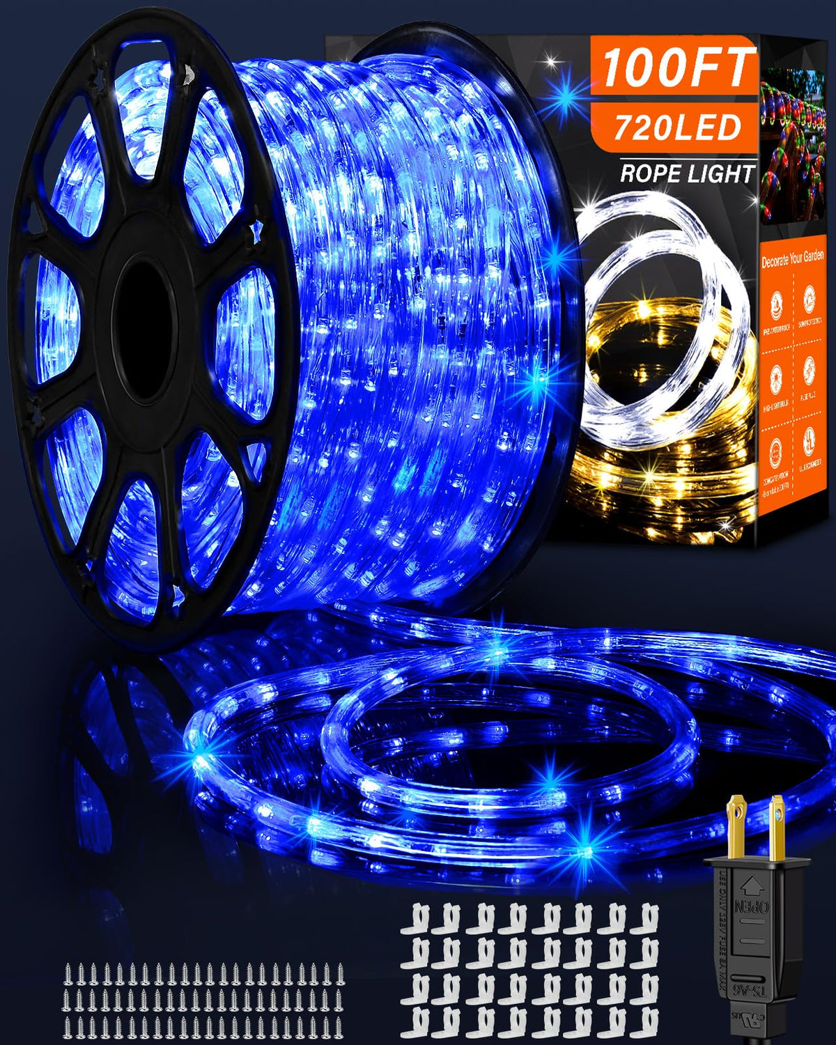 Q: How long are the Rope Lights and how many LEDs do they have?A: The Rope Lights are 100 feet long and feature 720 LEDs, providing superior brightness and quality for your outdoor and indoor decorations.