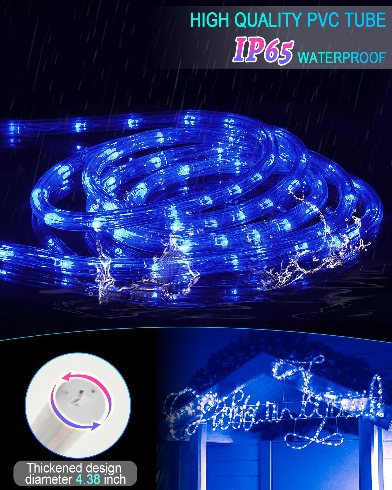 Q: Are the Rope Lights suitable for outdoor use?A: Yes, the Rope Lights are waterproof and encased in a durable PVC tube, making them ideal for outdoor decorations. Make sure to use a waterproof receptacle cover for the adapter when using them outdoors.