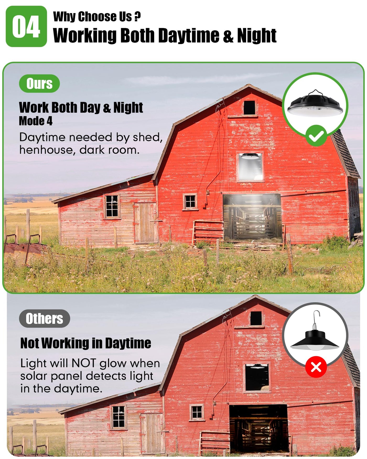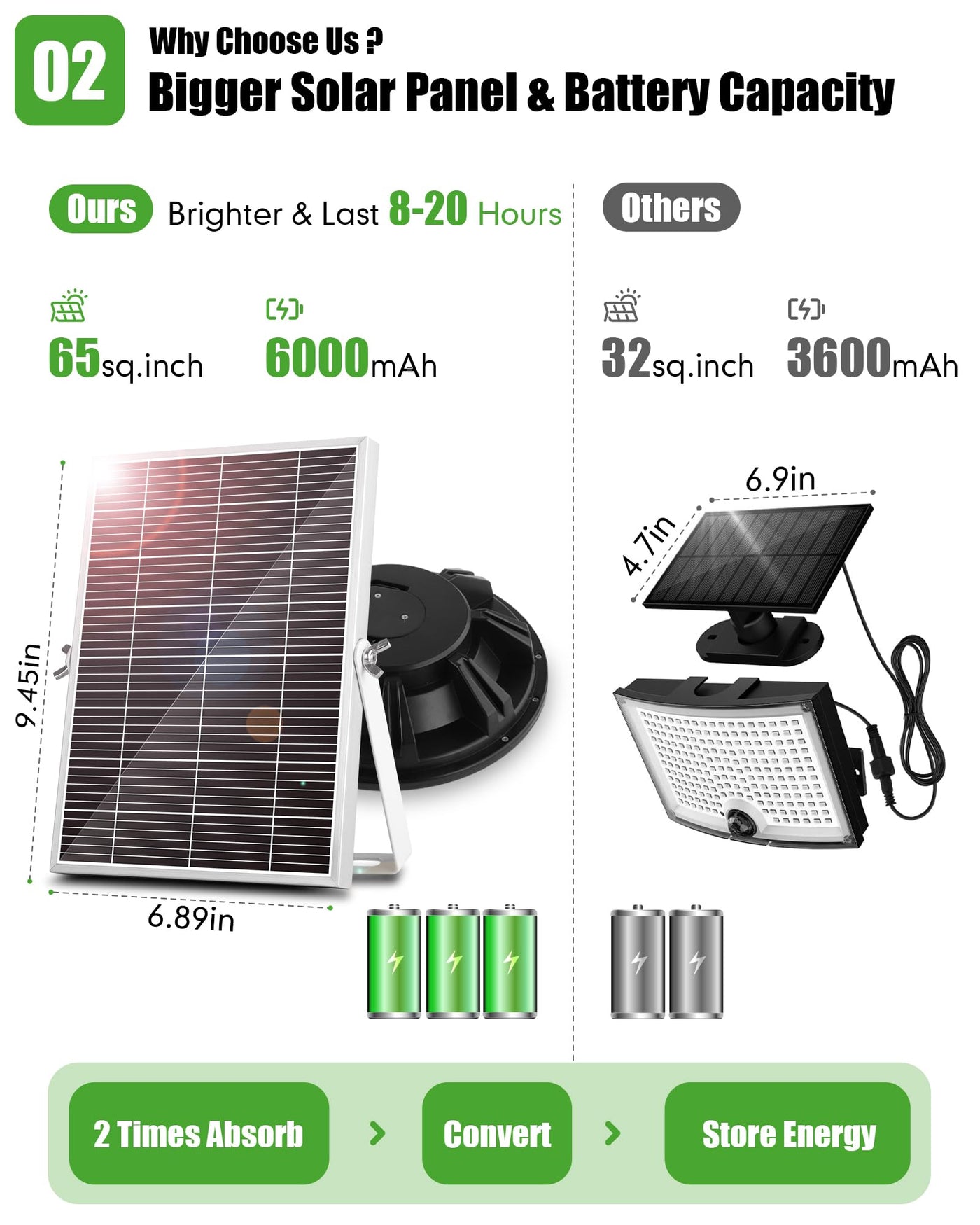 High-Efficiency Solar Panel: Featuring a massive 65 sq. inch solar panel, approximately three times larger than most competitors, this solar light absorbs and converts sunlight into electricity more effectively. Its efficiency guarantees bright lighting even on cloudy or rainy days.