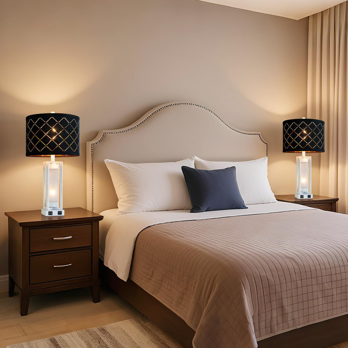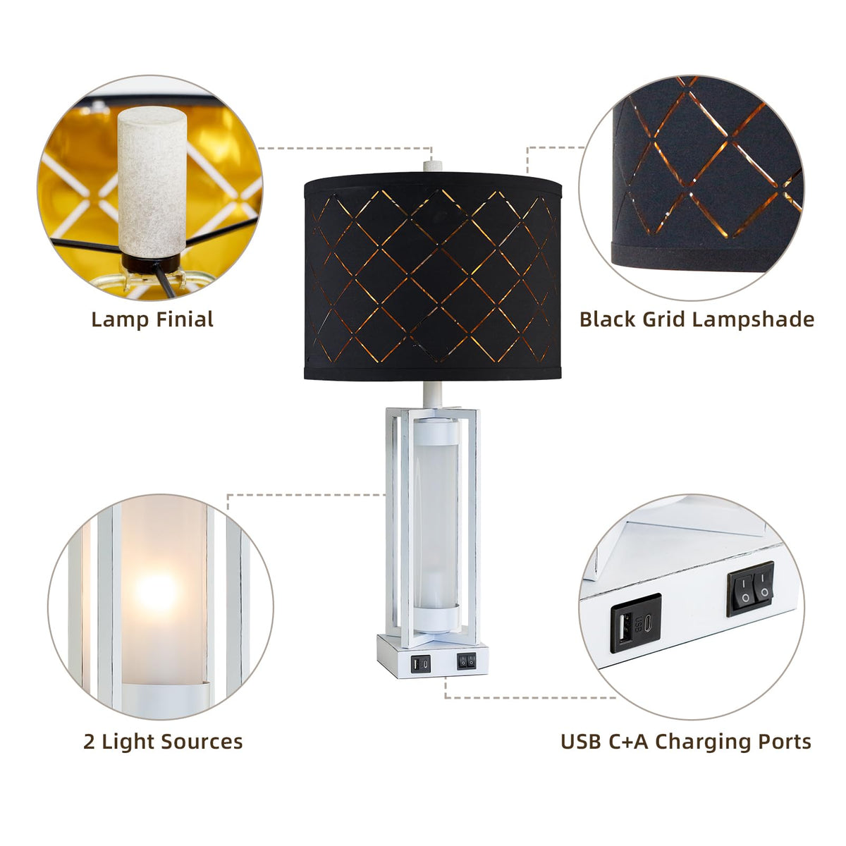 This Farmhouse Table Lamp Has An Attractive Design That Features A White Metal Frame For A Clean, Vintage Look. The Black Openwork Diamond Check Pattern On The Lampshade Is Both Robust And Elegant, And Also Subtly Incorporates A Hint Of Classical Flavor, Bringing An Understated Yet Luxurious Aesthetic To Your Home Space. Perfect For Placing In Different Environments Such As Study, Bedroom, Entrance Or Office, Whether It'S Modern Minimalist, Industrial, Scandinavian, Mid-Century Vintage Or Rustic Farmhouse Style, It Harmoniously Blends In And Shows A Unique Style Charm.< Br > Multiple Advanced Function< Br > Our Bedroom Table Lamp Is Equipped With Nightlight And Usb C+A Charging Ports, Which Is Both Practical And Beautiful. < Br>< Br > Premium Materials And Stable Structure < Br > Excellent Design, Great For Decorating Your Home < Br > The Design Of The Table Lamp Combines Industrial And Rural Styles. Cross-Shaped Metal Frame And Heavy Metal Base Make The Lamp Structure More Stable And Nightlight Safer. They Are Gorgeous And Exquisite Lamps For Your Family Or Friends. < Br >< Br > Simple Installation < Br > All Accessories Are Included In The Package For Your Assembly. According To The Instructions, You Will Get An Amazing Set Of Table Lamps In A Few Minutes, Saving Time And Effort. < Br >< Br > Watts Supported: 60W Max < Br > Power Supply: Wire Power < Br > Material: Glass+Metal+Linen < Br > Usb Charging Ports: 2 < Br > Switch Style: Double Button Switch Included Package: < Br > 2 Lampshades < Br > 2 Lamp Holders < Br > 4 Led Bulbs < Br > 1 User Manual< Br > The General Size Of A Lamp Is 25 Inches. Nice Decoration Of Farm Lamp, Bedroom And Living Room. < Br >