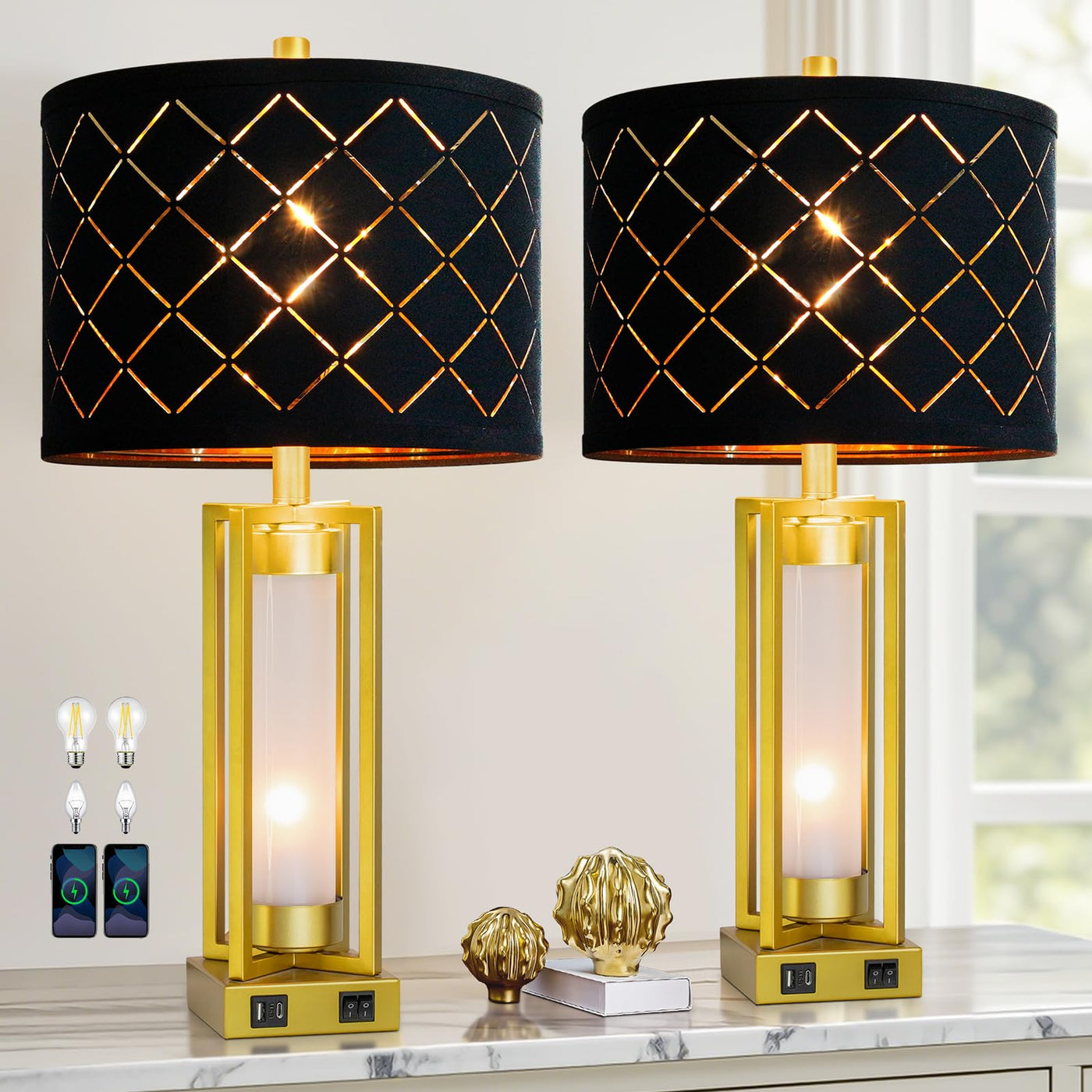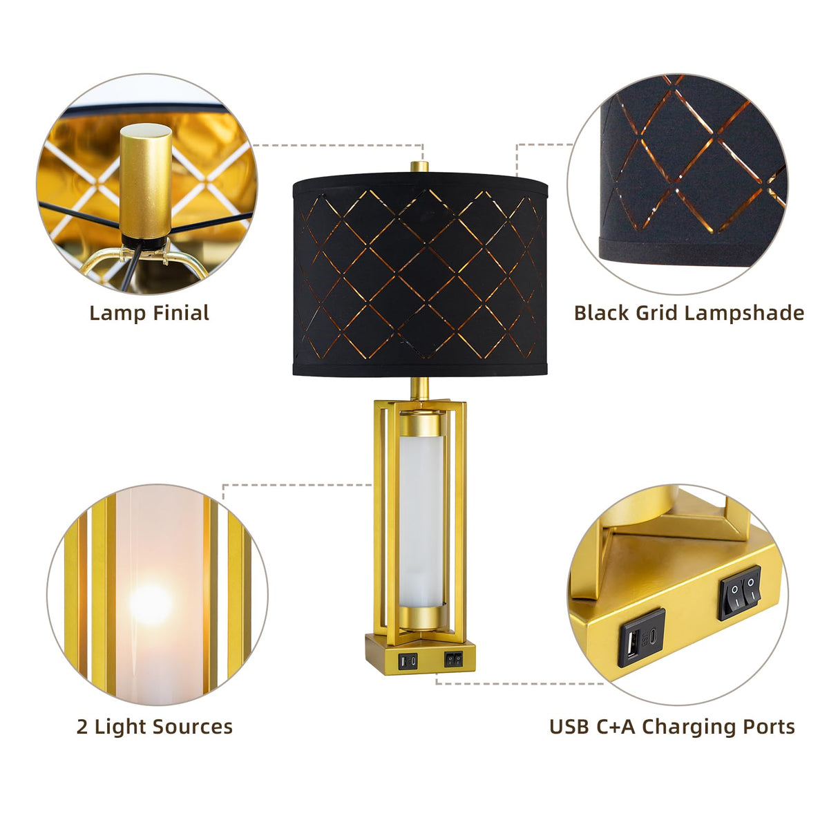 This 2 Piece Modern Table Lamp Set With Black Diamond Checkered Lampshade With Gold Metal Frame Is Solid And Elegant, Not Only Showing A Cool Modern Sense, Perfectly Blending Classical And Modern Elements, Bringing A Low-Key And Luxurious Beauty To Your Home Space. Whether It'S A Study, Bedroom, Entryway Or Office, It Can Show Its Unique Style Charm. Whether It Is Modern Simplicity, Industrial Style, Scandinavian Style, Mid-Century Vintage Style Or Country Farmhouse Style, It Can Be Harmoniously Integrated Into It.< Br > Multiple Advanced Function< Br > Our Bedroom Table Lamp Is Equipped With Nightlight And Usb C+A Charging Ports, Which Is Both Practical And Beautiful. < Br>< Br > Premium Materials And Stable Structure < Br > Excellent Design, Great For Decorating Your Home < Br > The Design Of The Table Lamp Combines Industrial And Rural Styles. Cross-Shaped Metal Frame And Heavy Metal Base Make The Lamp Structure More Stable And Nightlight Safer. They Are Gorgeous And Exquisite Lamps For Your Family Or Friends. < Br >< Br > Simple Installation < Br > All Accessories Are Included In The Package For Your Assembly. According To The Instructions, You Will Get An Amazing Set Of Table Lamps In A Few Minutes, Saving Time And Effort. < Br >< Br > Watts Supported: 60W Max < Br > Power Supply: Wire Power < Br > Material: Glass+Metal+Linen < Br > Usb Charging Ports: 2 < Br > Switch Style: Double Button Switch Included Package: < Br > 2 Lampshades < Br > 2 Lamp Holders < Br > 4 Led Bulbs < Br > 1 User Manual< Br > The General Size Of A Lamp Is 25 Inches. Nice Decoration Of Farm Lamp, Bedroom And Living Room. < Br >