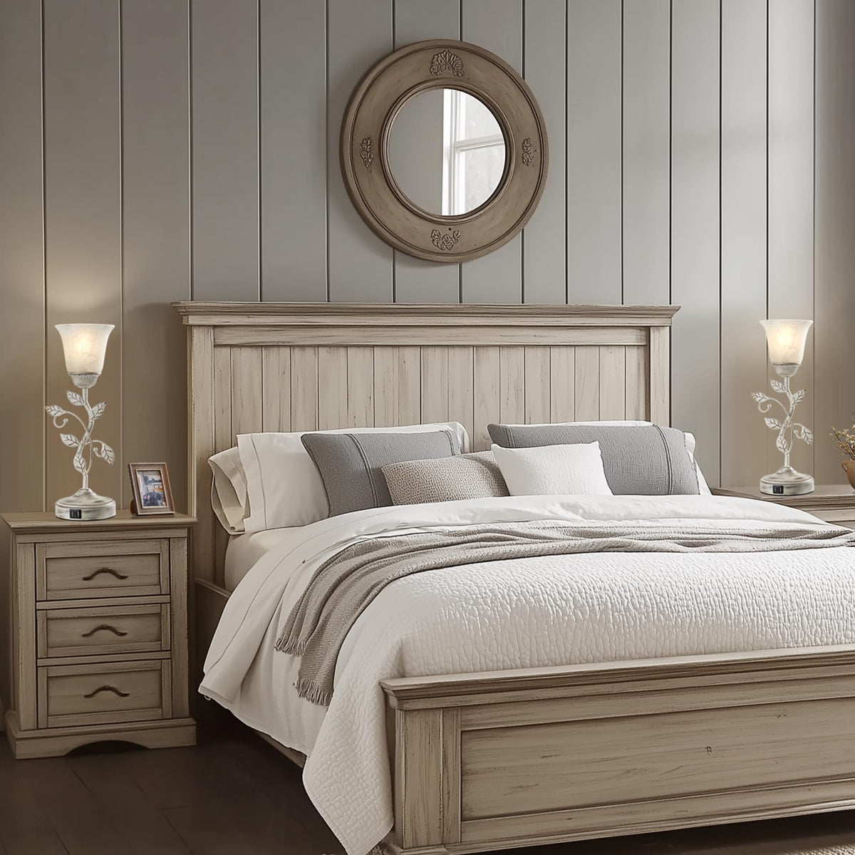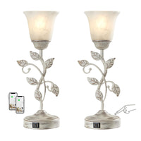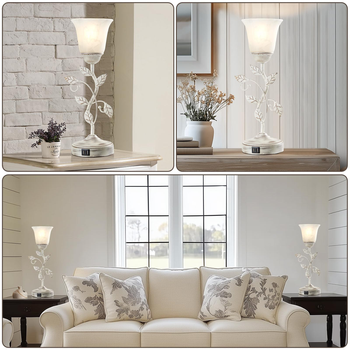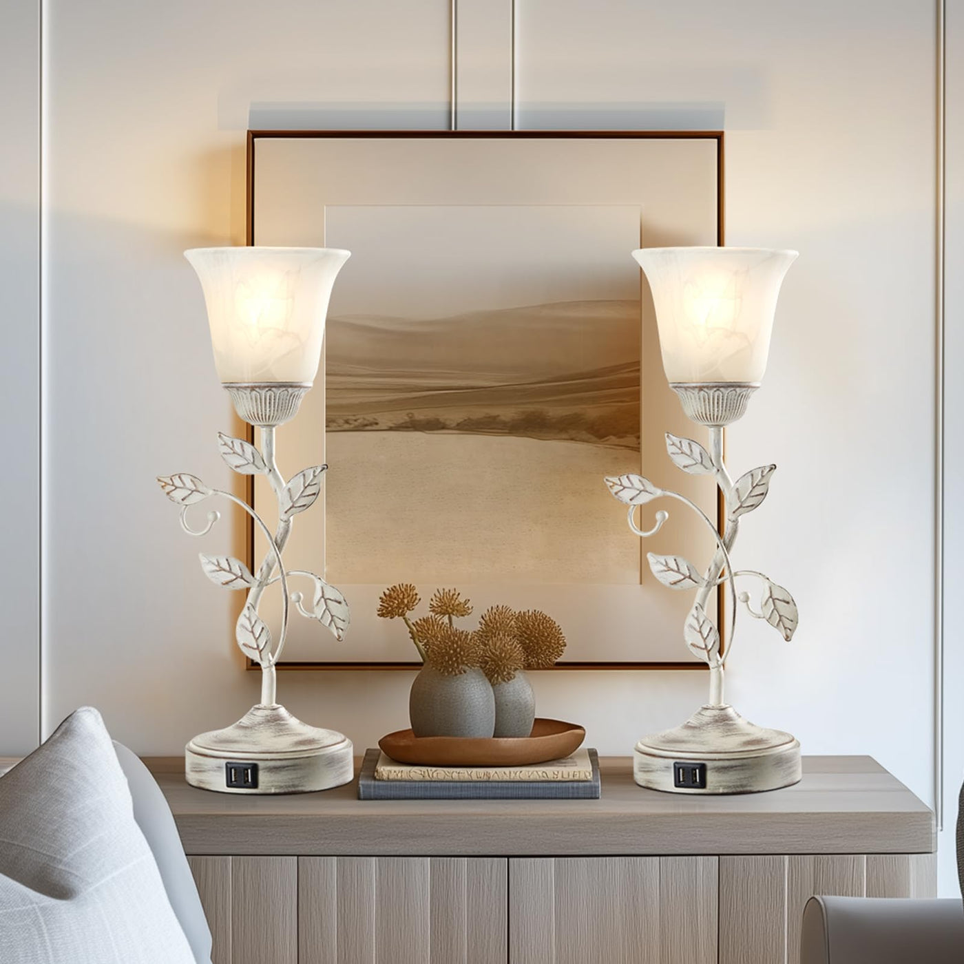 Roriano Set Of 2 Rustic Touch Table Lamps For Bedroom, 3-Way Dimmable Nightstand Flower Lamp With 2 Usb Ports, Retro White Glass