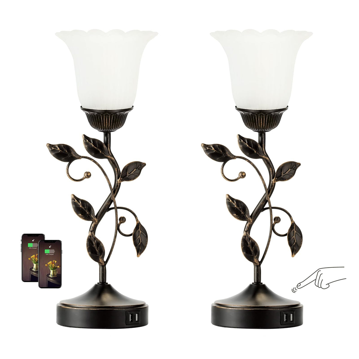 Roriano Set Of 2 Touch Bedside Vintage Lamps With 2 Usb Ports, 3-Way Dimmable Flower Lamps, White Glass Shade Rustic Leaf Lamp F