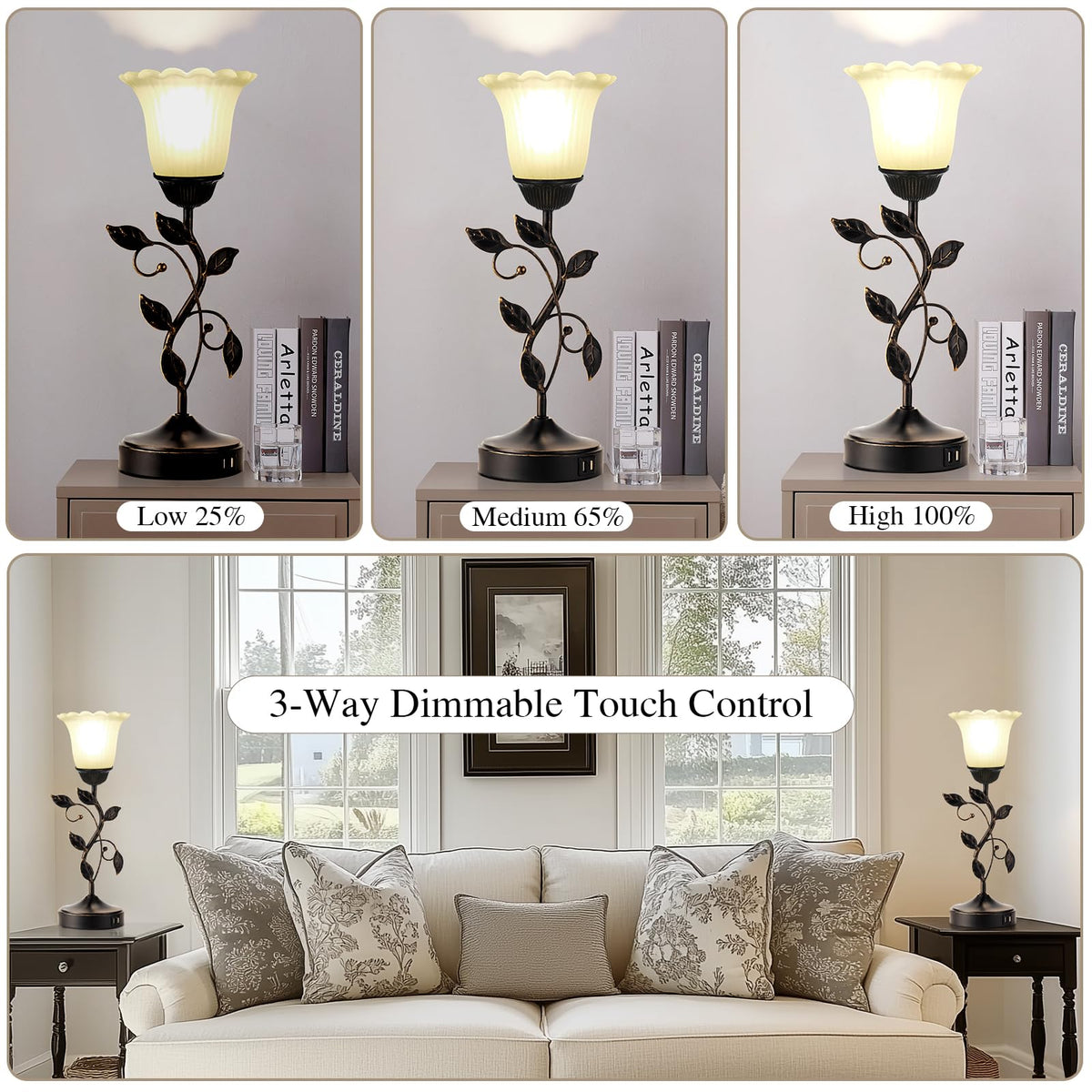 The beauty of nature to light up your space! This rustic leaf table lamp is a perfect blend of modern and natural art. The bronze metal body of the lamp is paired with an amber glass shade to show a unique vintage style. Spilling warm light into every corner, it instantly fills your living room, bedroom or study with tranquility and comfort. Multi-functional design, make life more convenient The base of this living room table lamp features two USB fast charging ports, so you can easily charge it while working or resting and say goodbye to power anxiety. You can freely adjust the light on/off and three brightness levels by just touching the lamp base or stem. To ensure stability and safety when in use, the bottom is also equipped with a non-slip pad to avoid any unwanted sliding or tilting. Quick installation, easy to get started We designed a simple installation procedure for this bedroom table lamp, all accessories are complete, follow the manual, you can easily finish the assembly in just a few minutes, eliminating the tedious installation process. Save time and effort from packing to lighting.