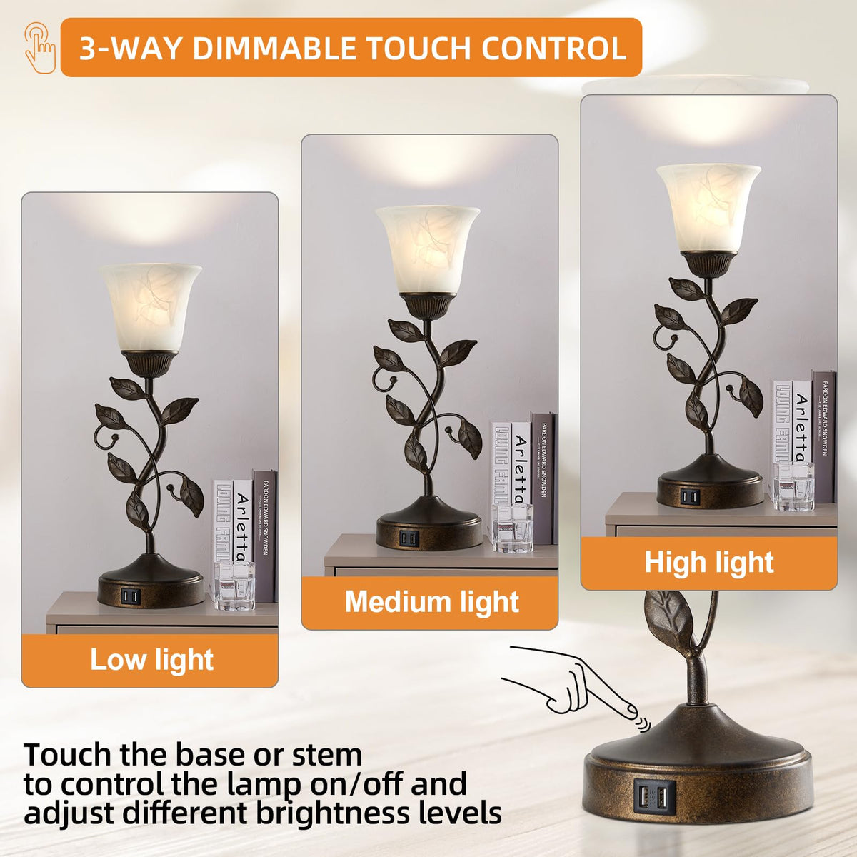 Roriano Touch Bedside Table Lamp, Vintage Nightstand Lamp With 2 Usb Ports For Living Room, 3 Way Dimmable Leaf Lamp Retro Table