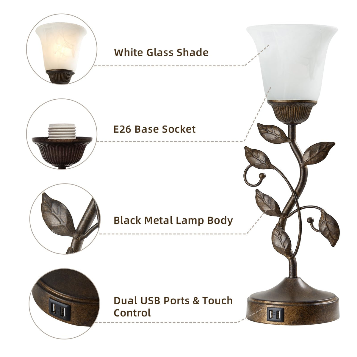 Unique Leaf Design, Perfect Home Decor! The Living Room Rustic Leaf Table Lamp Adopts A Sturdy Metal Lamp Body And White Glass Lampshade, The Climbing Vines On The Base Accented With Leaves, Which Is The Perfect Fusion Of Vintage And Stylish, Creating A Warm And Charming Atmosphere In Any Room. Perfect Match With Retro, Traditional, Rustic, Farmhouse, Vintage And Other Different Home Decoration Styles. Multiple Advanced Features With 2 Usb Fast Charging Ports On The Base Of The Bedroom Lamp, You Can Charge Multiple Electronic Devices At The Same Time Within Reach, Whether You Are Working Or Studying. Easily Control The Lamp On/Off And Adjust 3 Levels Of Brightness With A Touch Of The Lamp Base Or Stem, Giving You The Flexibility To Control Your Lighting Environment. Premium Quality&Stable Construction Our Table Lamp Is Made Of Sturdy Black Metal, With Unique Leaf Lamp Body Design And Exquisite White Glass Lampshade, Easily Creating The Perfect Atmosphere For Any Occasion. Featuring Advanced Anti-Slip Pads, The Lamp Is Very Stable And Safe To Use. Super Easy Installation All Accessories Are Included For Your Quick Installation, Follow The Manual, It Only Takes Few Steps For You To Get A Great Table Lamp Sets In Few Seconds, Saving Much Time And Trouble. Specification: Supportive Wattage: 60W Max Power Source: Corded-Electric Material: Glass+Metal+Fabric Usb Charging Port: 2 Switch Style: Touch Control Switch Package Included: 2 X Lampshades 2 X Lamp Bases 2 X Led Bulbs 1 X User Manual A Small And Exquisite Table Lamp Is The Best Choice For Your Living Room And Bedroom Decoration.