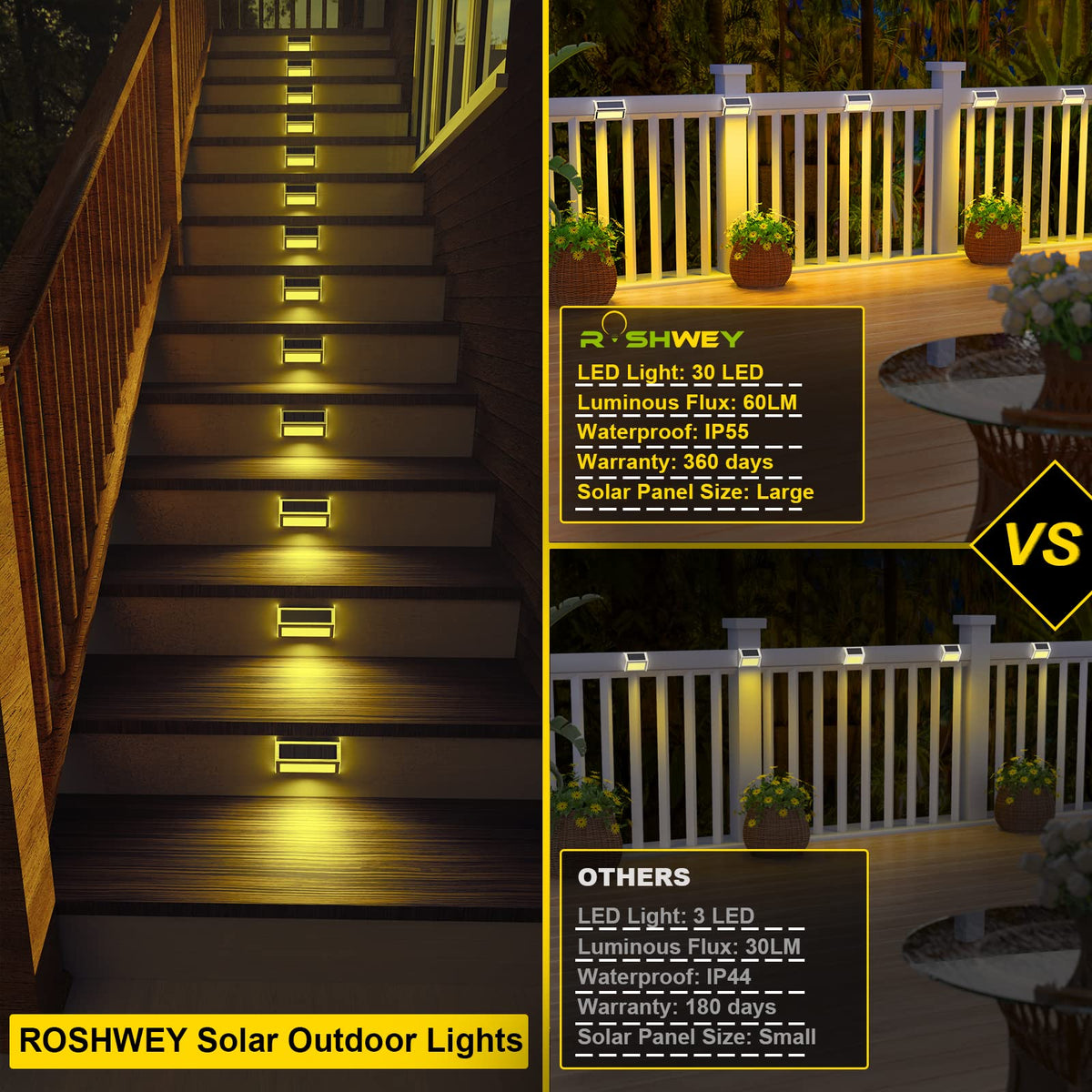 Roshwey Deck Lights, 10 Pack 30 Led Deck Lights Solar Powered Outdoor Waterproof, Patio Step Lighting Outdoor Decor, Stainless S