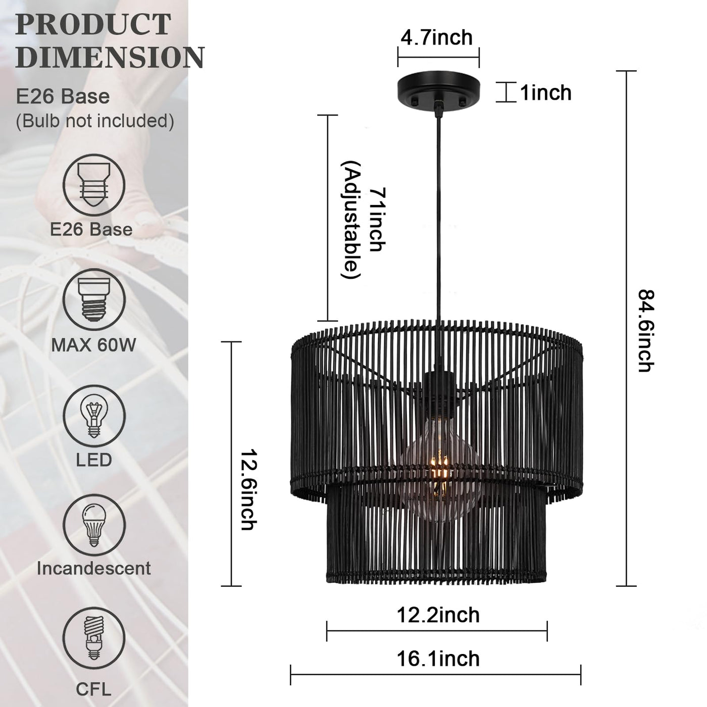 Q: What are the dimensions of the Rosient Woven Rattan Pendant Lamp?A: The Rosient Woven Rattan Pendant Lamp has a diameter of 16.1 inches and a height of 12.6 inches, making it a perfect size for various spaces.