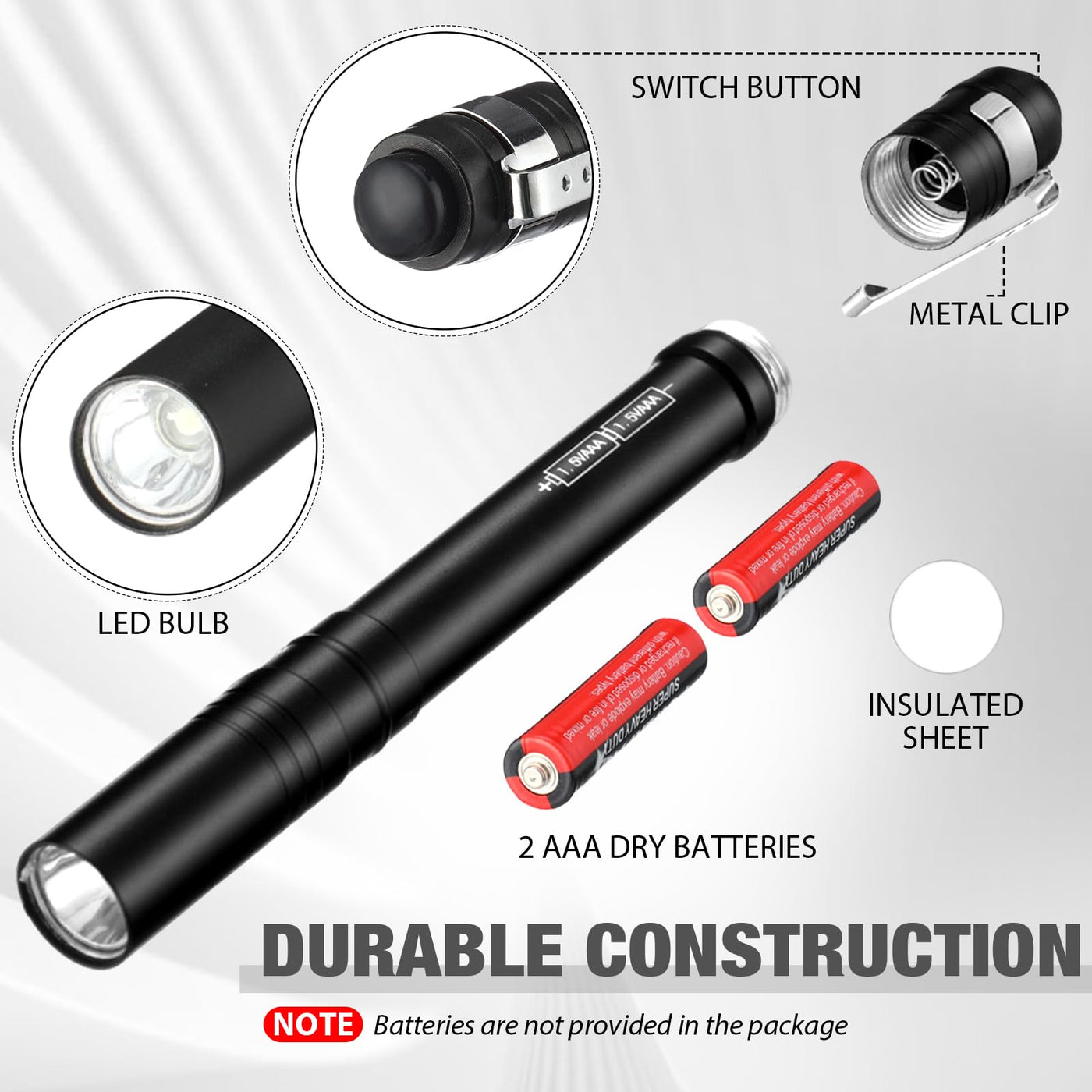 Features: Multipurpose functionality: Not only suitable for outdoor activities such as night walk, night reading, camping, or hiking, but the LED pocket pen light is also suitable for indoor uses. Thus, making it a practical add-on for every household. Exceptional portability: Each LED pen light is designed to prioritize user comfort. Its lightweight design fits effortlessly in your shirt, pocket, jeans, or pants. Easy to carry everywhere, it offers consistent convenience and a reliable source of light anytime, anywhere. Specifications: Material: aluminum alloy and LED bulb Surface color: black Size: about 5.51 x 0.51 inches/ 14 x 1.3 cm Package includes: 36 x LED penlights bulk Notes: Manual measurement, please allow slight errors on size. The color may exist a slight difference due to different screen displays. Batteries are not included.