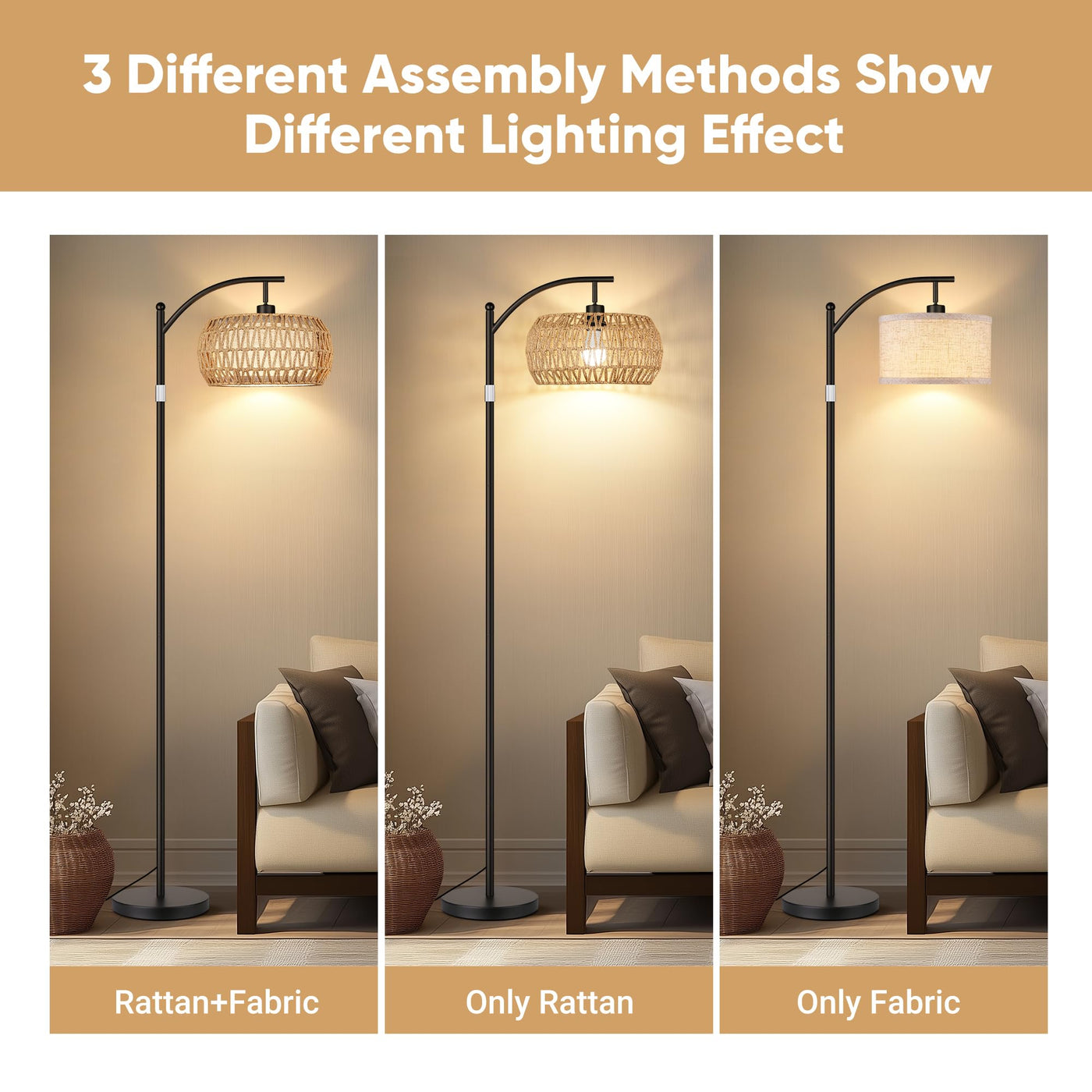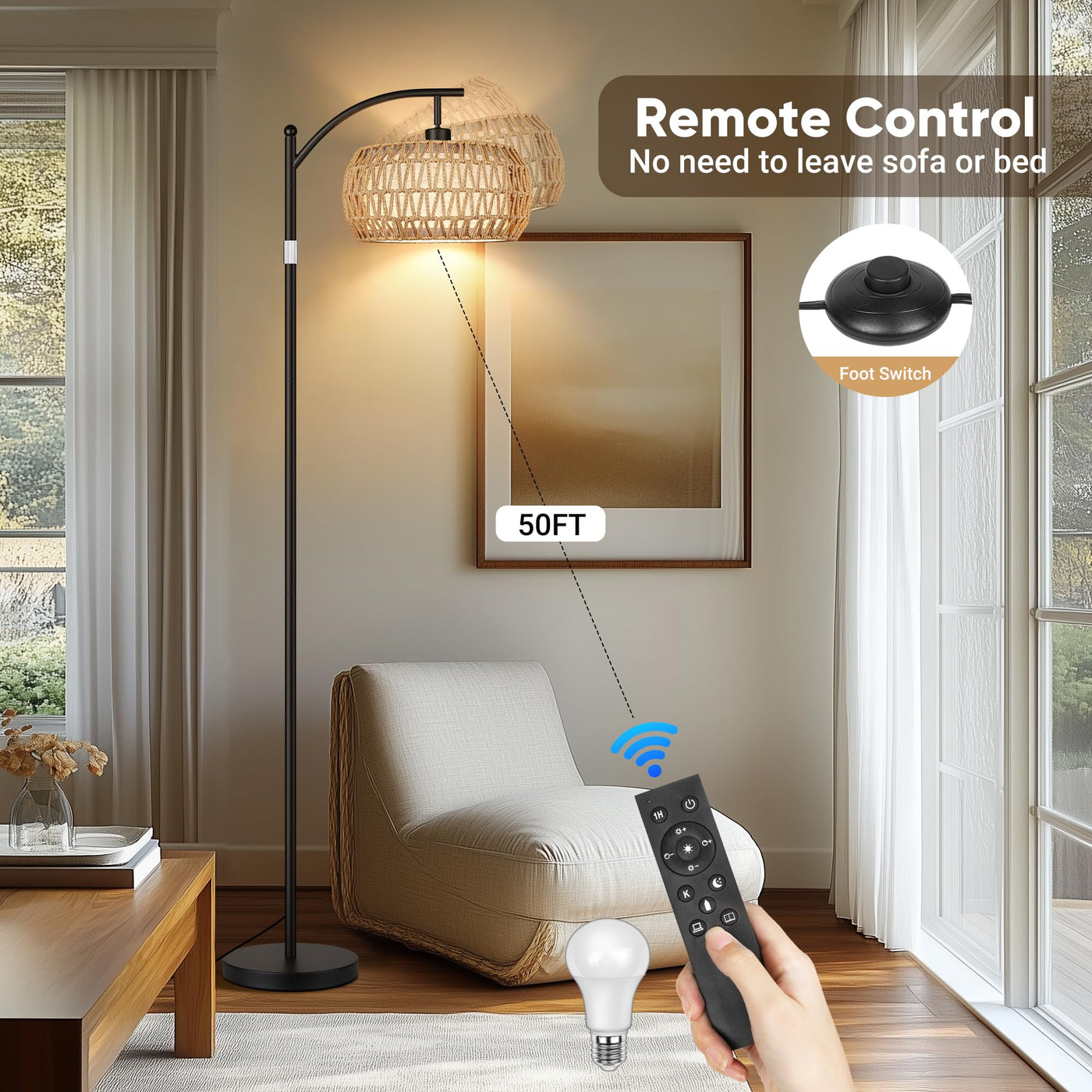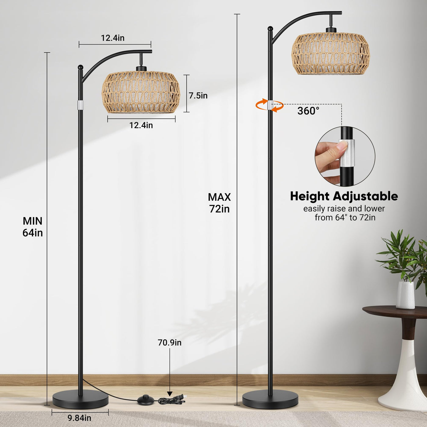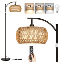 Rottogoon Boho Floor Lamp With Dimmable Bulb, Rattan &Linen Double Shades, Boho Standing Tall Lamps With Foot Switch, Bohemian F