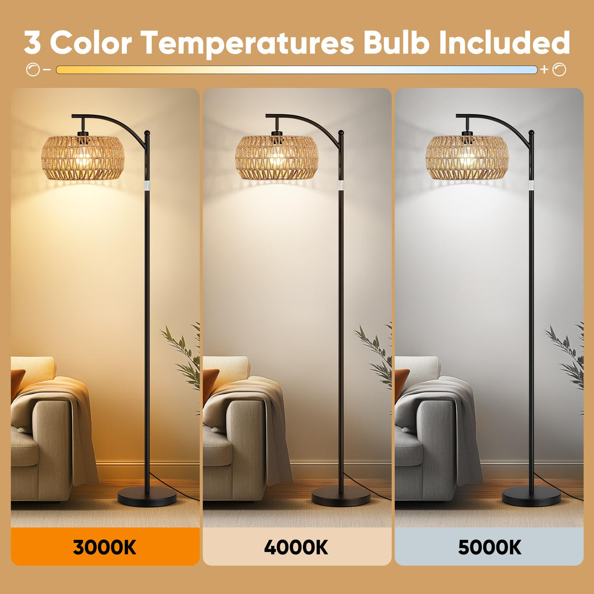Q: What are the different color temperatures available for the ROTTOGOON Boho Floor Lamp?A: The ROTTOGOON Boho Floor Lamp offers three adjustable color temperatures: 3000K for a warm ambiance, 4000K for a neutral light, and 5000K for a cool, bright setting. You can easily switch between these options using the convenient foot switch.