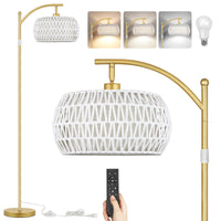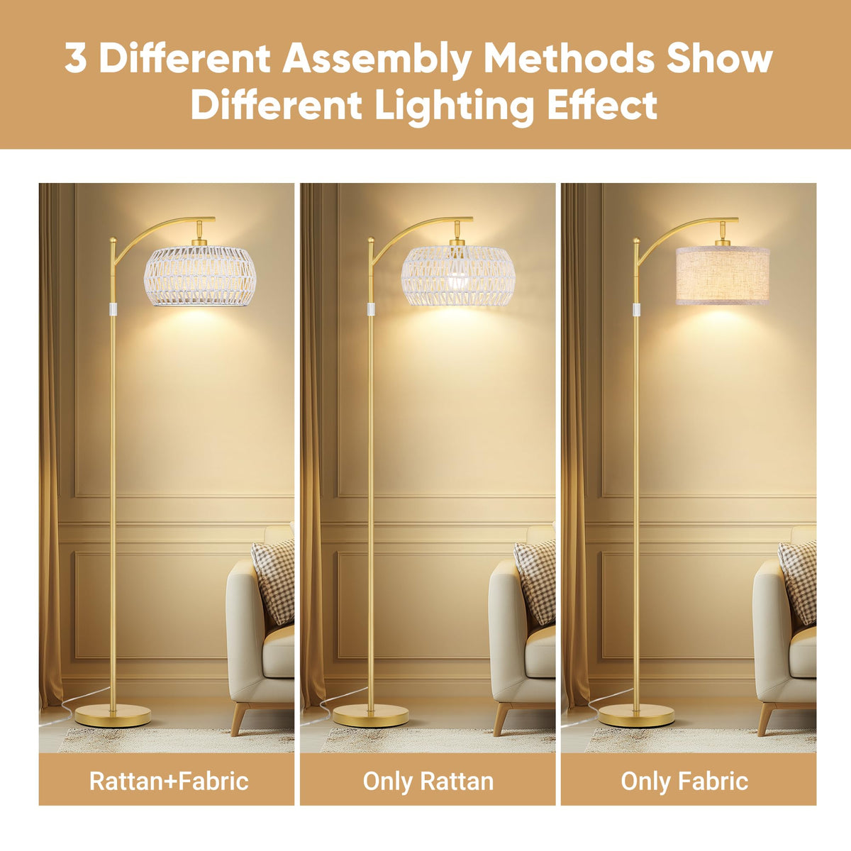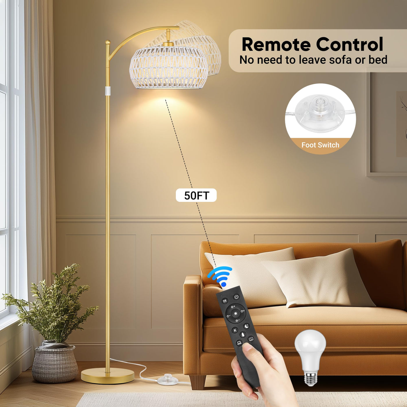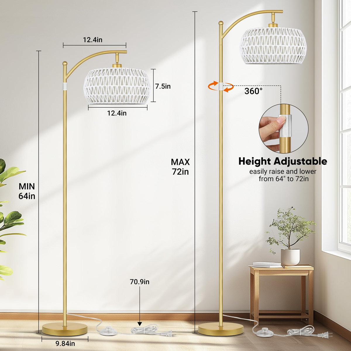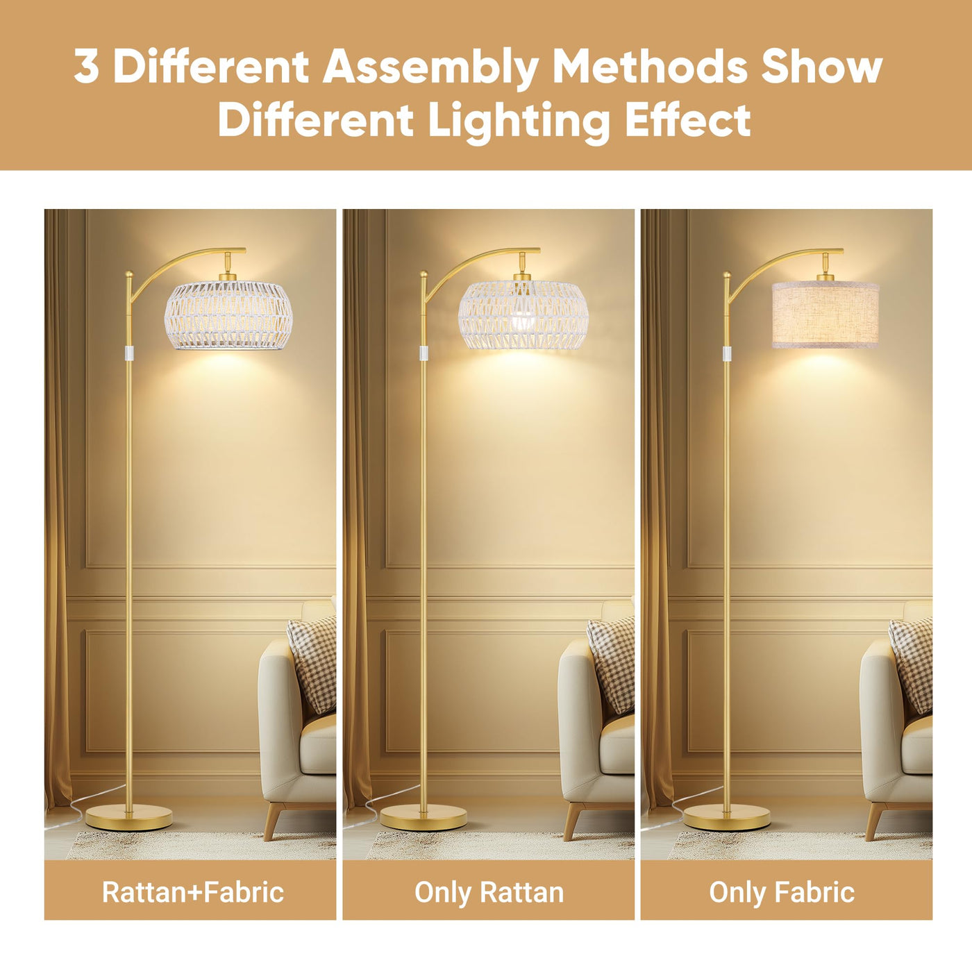 Rottogoon Boho Floor Lamp With Dimmable Bulb, White Rattan &Linen Double Shades, Boho Standing Tall Lamps With Foot Switch, Gold