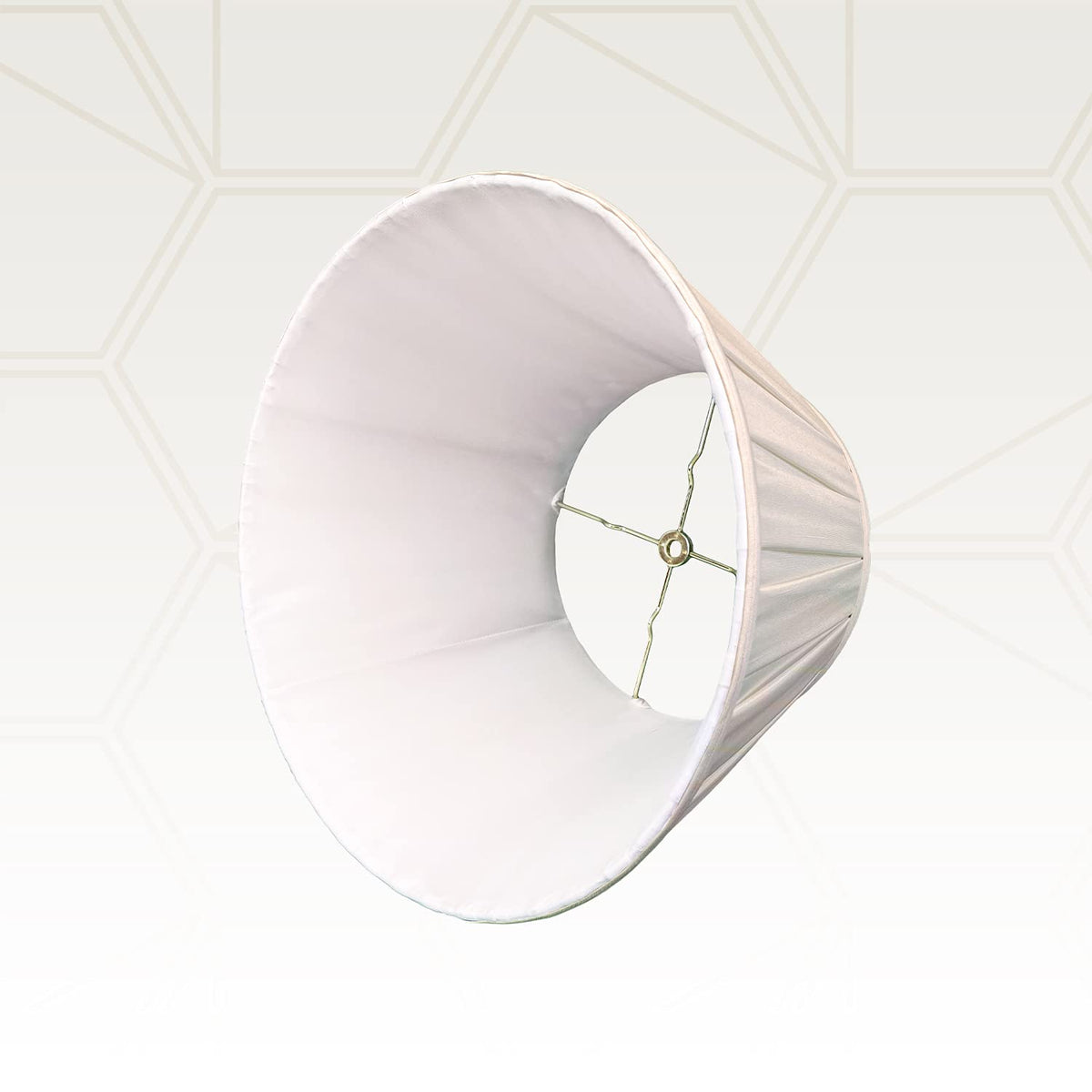 Q: What are the dimensions of the Royal Designs Empire English Pleat Basic Lamp Shade?A: The Royal Designs Empire English Pleat Basic Lamp Shade measures 10 inches at the top, 14.5 inches at the bottom, and stands 10 inches tall.
