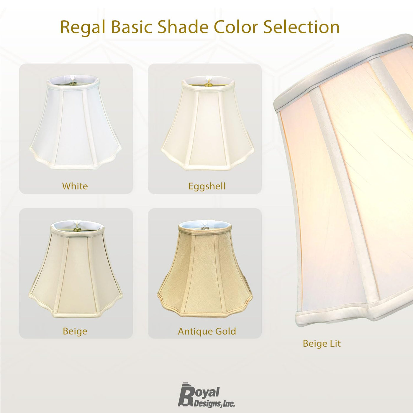 The traditional bell-shaped lamp shade gets an upgrade with a subtle scalloped flare at the bottom. Made of tailored silk-type shantung fabric with an off-white softback lining to create a warm, soft glow. The Corner Scalloped Lamp Shade with Flared Bottom is part of the Royal Designs, Inc. Timeless™ Basic Shade Collection. Royal Designs has been in the lamp shade business since 1993 with our multiple shade lines that exemplify handcrafted quality and value. Height is measured by slant height from top to bottom of the lampshades’ front face. Measurements listed as (TOP x BOTTOM x HEIGHT). Please measure your existing shade--a replacement harp may be needed for a proper fit or additional adjustment if changing height of shade.