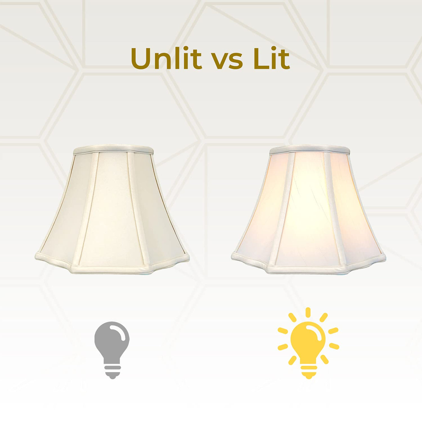The traditional bell-shaped lamp shade gets an upgrade with a subtle scalloped flare at the bottom. Made of tailored silk-type shantung fabric with an off-white softback lining to create a warm, soft glow. The Corner Scalloped Lamp Shade with Flared Bottom is part of the Royal Designs, Inc. Timeless™ Basic Shade Collection. Royal Designs has been in the lamp shade business since 1993 with our multiple shade lines that exemplify handcrafted quality and value. Height is measured by slant height from top to bottom of the lampshades’ front face. Measurements listed as (TOP x BOTTOM x HEIGHT). Please measure your existing shade--a replacement harp may be needed for a proper fit or additional adjustment if changing height of shade.