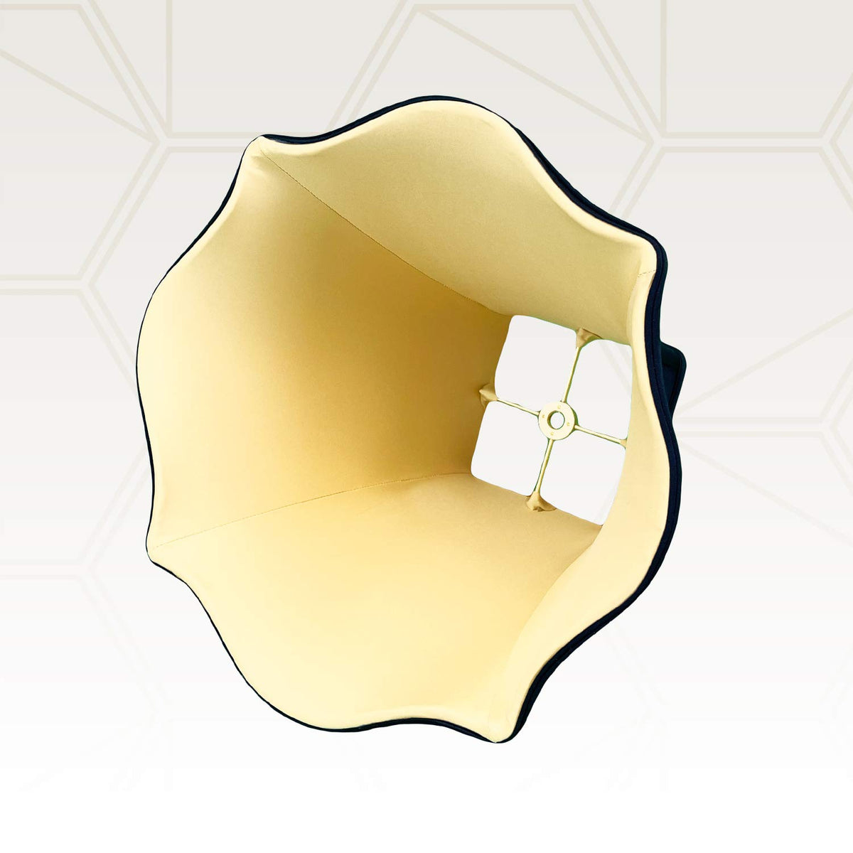 Q: What material is the lamp shade made of?A: This lamp shade is made from hand-tailored silk-type shantung fabric, complemented by a premium gold softback lining.