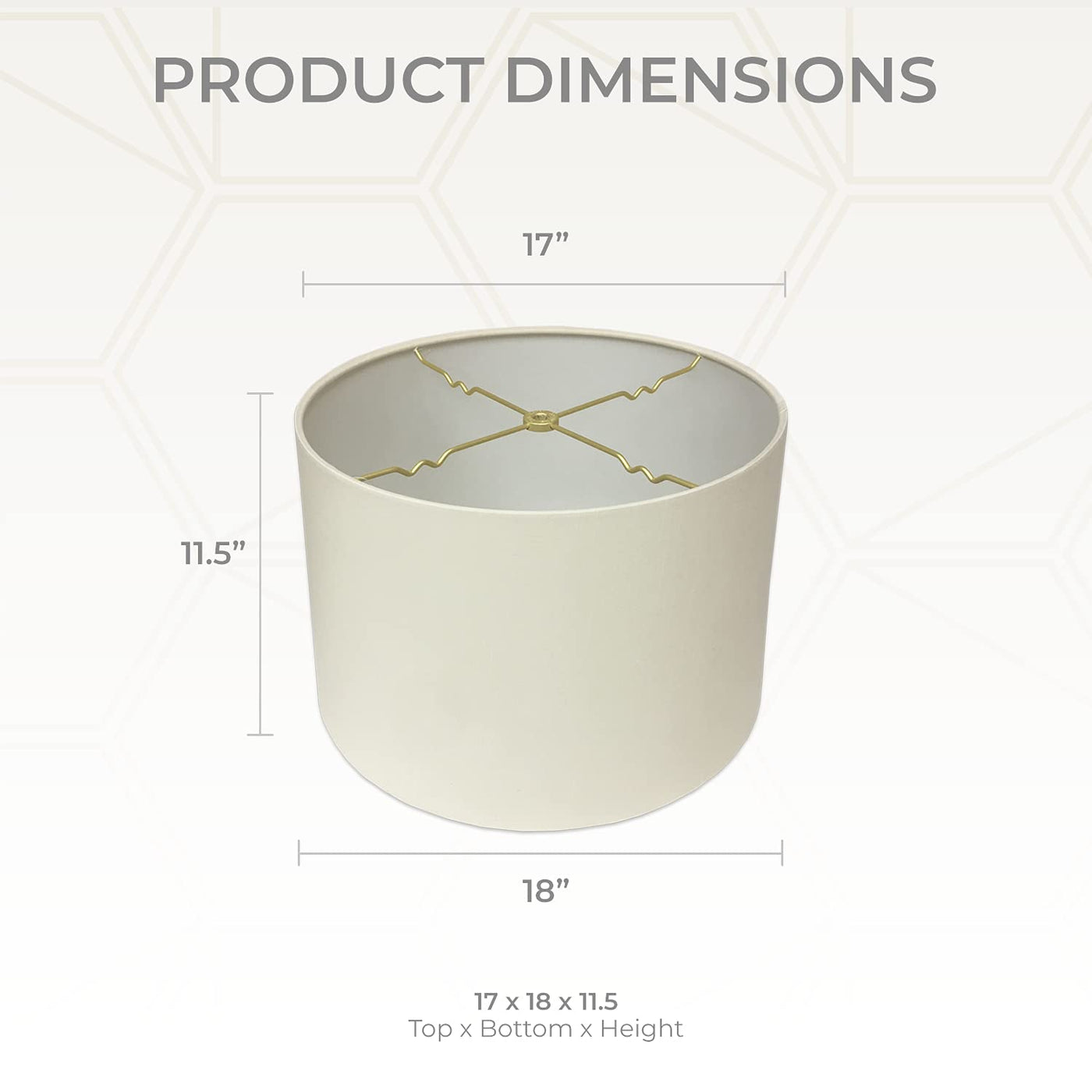 Q: What are the dimensions of the Royal Designs Shallow Drum Hardback Lamp Shade?A: The Royal Designs Shallow Drum Hardback Lamp Shade measures 17 inches at the top, 18 inches at the bottom, and has a height of 11.5 inches.