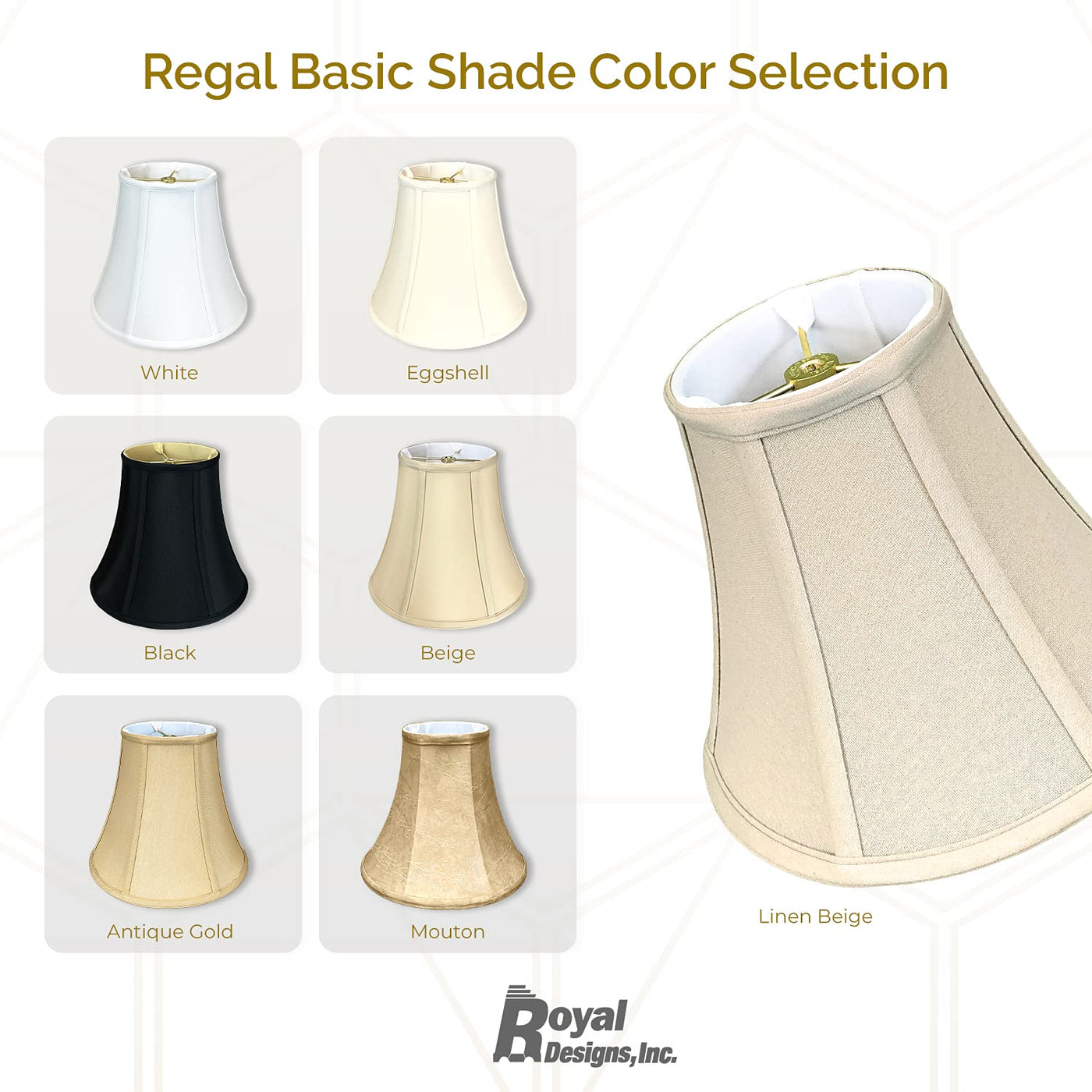 This true bell basic lampshade is a part of Royal Designs, Inc. Timeless basic shade Collection and is perfect for anyone who is looking for a traditional yet stunning lampshade. Royal designs has been in the lampshade business since 1993 with their multiple shade lines that exemplify handcrafted quality and value. Exterior fabric: hand tailored silk-type shantung (except linen, mouton, burlap & faux rawhide fabrics) interior fabric: off-white softback lining (black, burlap & faux rawhide fabrics have gold lining) washer: standard brass-finish spider Fitter, use a finial to fasten shade. (All shades with 9 in + top diameter have a top-notch Fitter for use on a 6 in or 8 in reflector bowl) trim: top and bottom trim (single or double) with vertical piping frame: heavy grade rust resistant metal frame bulb: suggested maximum wattage is 150-watt for most sizes height is measured by slant height from top to bottom of the lampshades front face please measure your existing shade-aa replacement harp may be needed for a proper fit or additional adjustment if changing height of shade