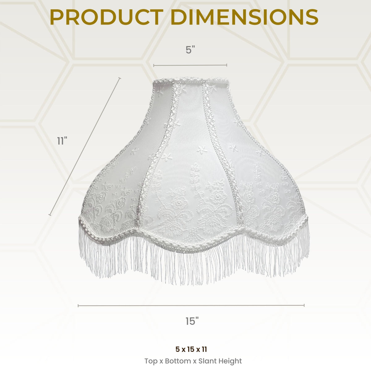 Q: What are the dimensions of the Royal Designs Victorian Scalloped Lamp Shade?A: The Royal Designs Victorian Scalloped Lamp Shade measures 5 inches in height, 15 inches in width, and 15 inches in length.