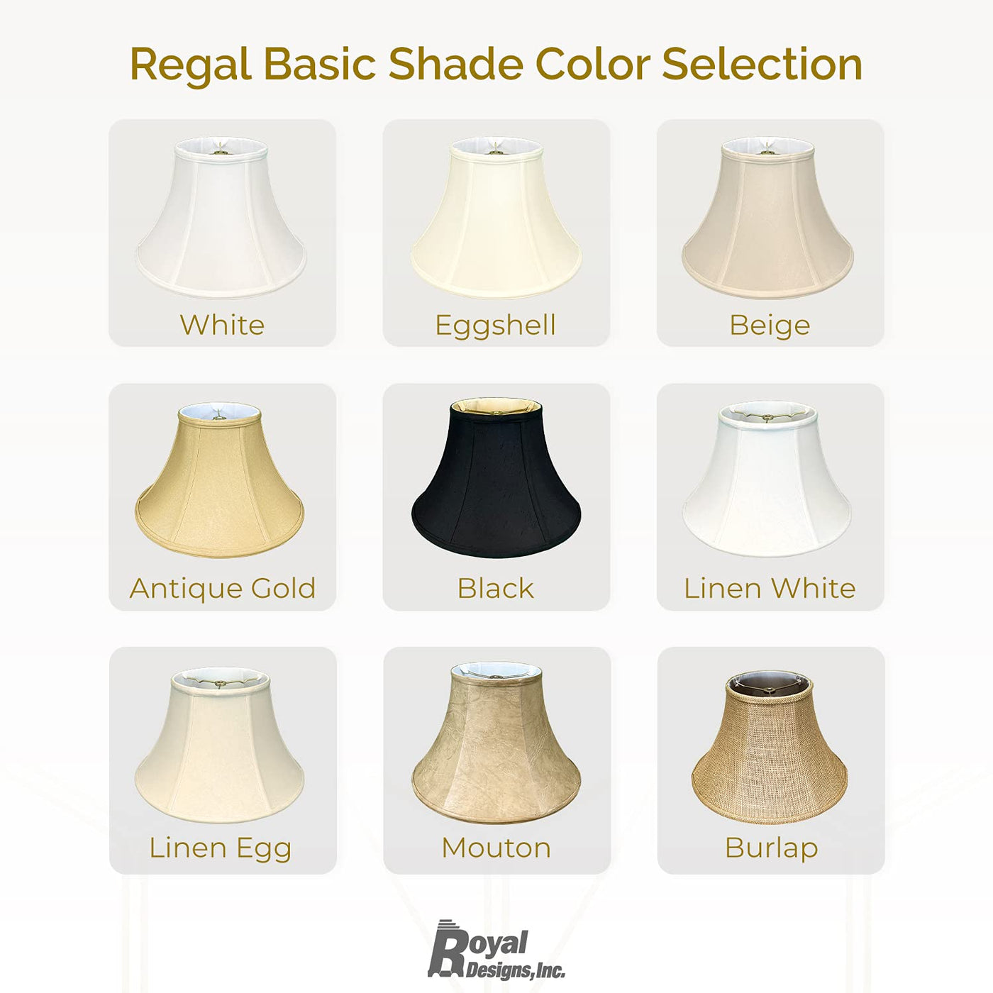 This Shallow Bell Basic Lampshade is a part ofRoyal Designs, Inc. Timeless Basic Shade Collection and is perfect for anyone who is looking for a traditional yet stunning lampshade.Royal Designs has been in the lampshade business since 1993 with their multiple shade lines that exemplify handcrafted quality and value. Exterior Fabric: Hand Tailored Silk-Type Shantung (except Linen, Mouton, Burlap & Faux Rawhide fabrics) Interior Fabric: Off-White Softback Lining (Black, Burlap & Faux Rawhide fabrics have gold lining) Washer: Standard brass-finish spider fitter, use a finial to fasten shade (this style is available in UNO and CLIP fitters) (All shades with 9”+ top diameter have a V-Notch fitter for use on a 6” or 8” reflector bowl) Trim: Top and bottom trim (single or double) with vertical piping Frame: Heavy grade rust resistant metal frame Bulb: Suggested maximum wattage is 150-watt for most sizes Height is measured by slant height from top to bottom of the lampshades’ front face Please measure your existing shadea replacement harp may be needed for a proper fit or additional adjustment if changing height of shade