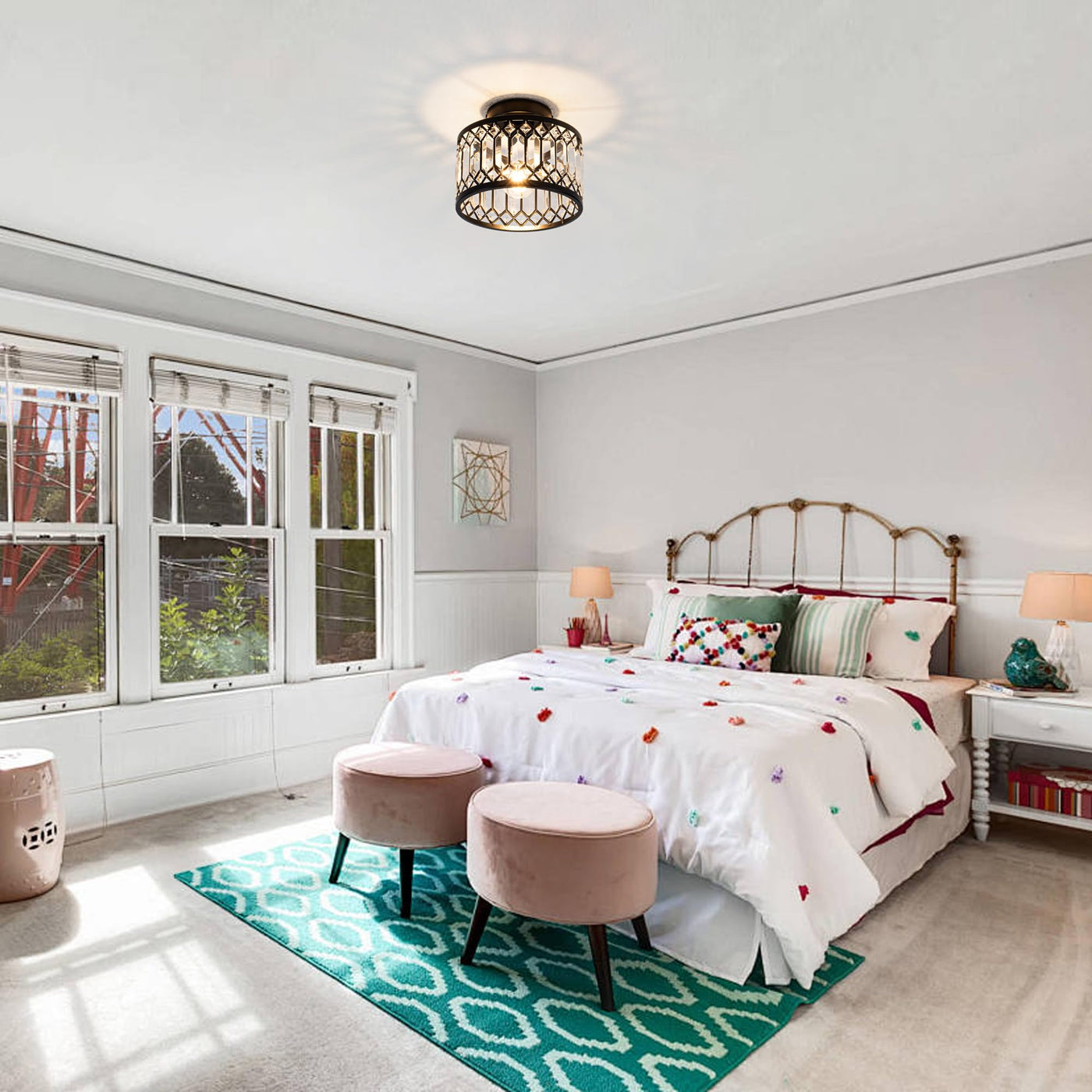 This ceiling light features a sleek black frame complemented by a stunning crystal shade. The round metal construction ensures durability while the clear crystal accents reflect light beautifully, creating a vibrant atmosphere. The compact design makes it suitable for spaces with lower ceilings, making it a versatile choice for various settings.