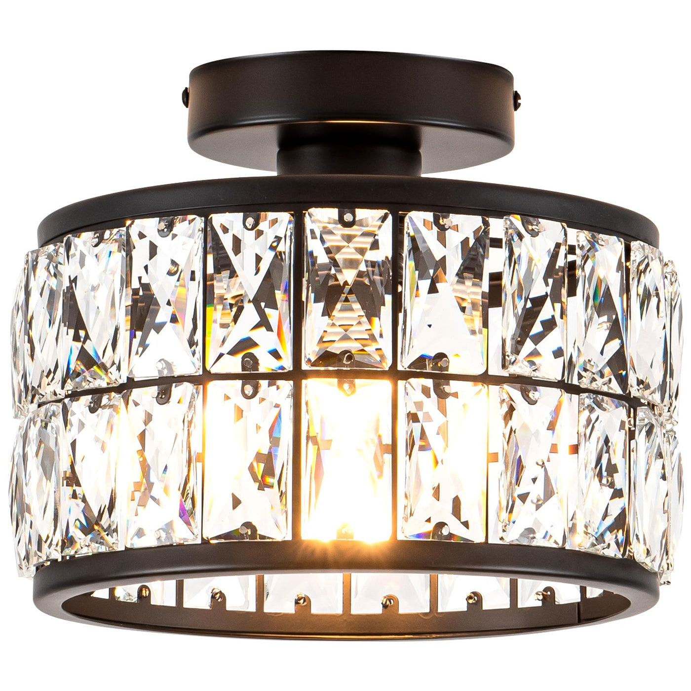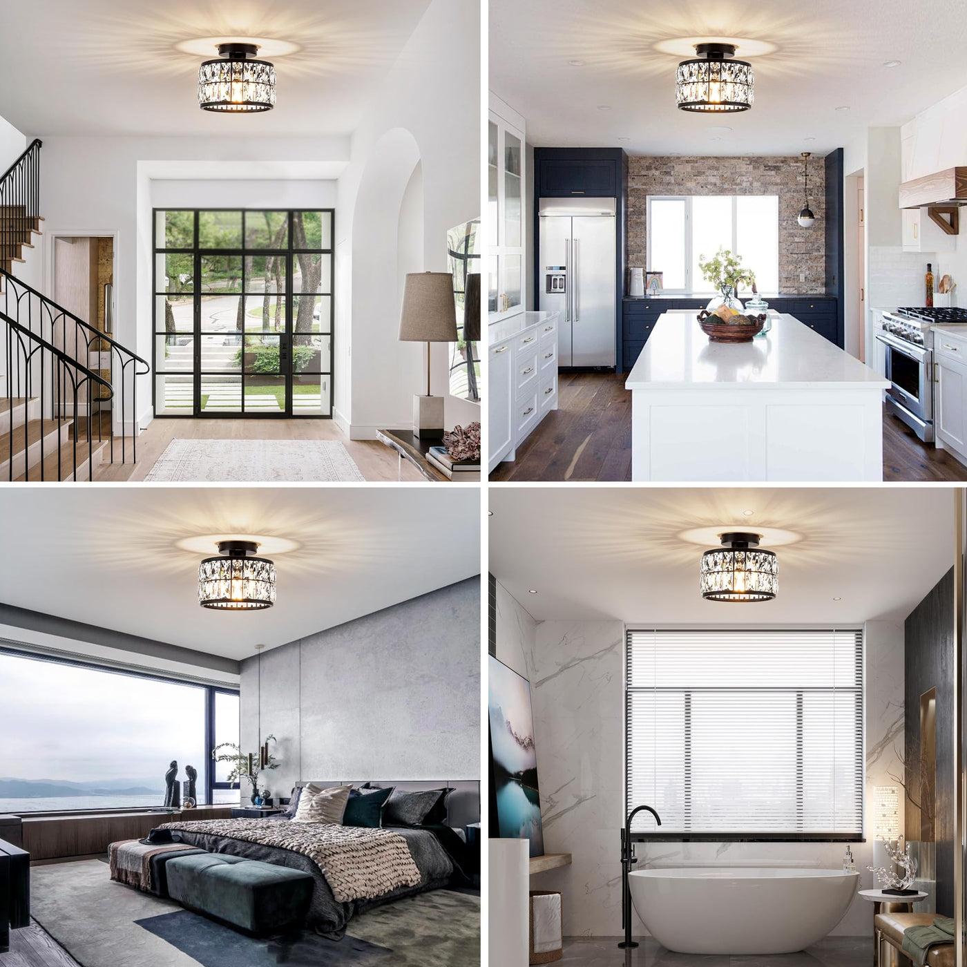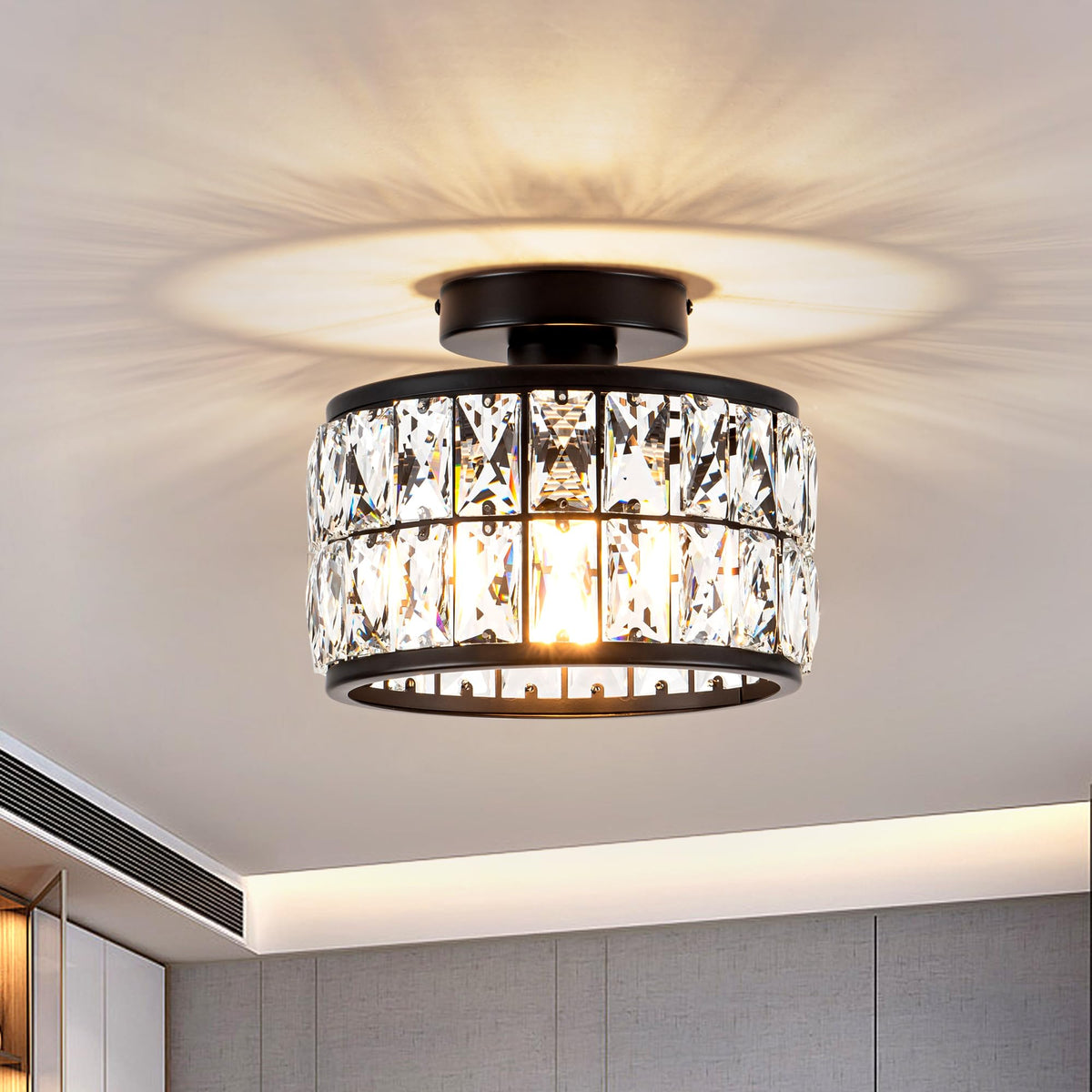 Crystal Semi-Flush Mount Design: Combines a black metal frame with a crystal shade for a modern and elegant appearance.