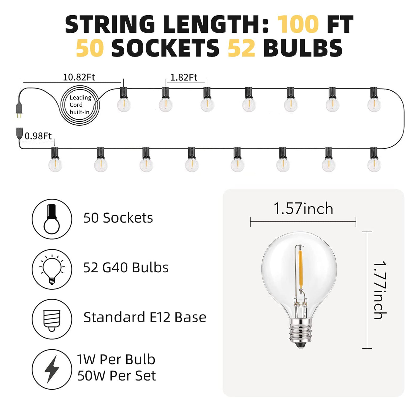 Rtty 100Ft Outdoor String Lights - Warm White G40 Led Patio Lights With 52 Waterproof Bulbs