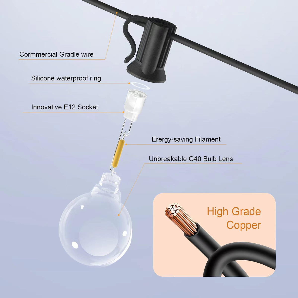 - **Connectable Design**: Featuring a generous 50 ft length with a 9 ft lead, 1.8 ft spacing between bulbs, and a female connector tail, you can connect up to 20 strands end to end, providing versatility in lighting larger areas.