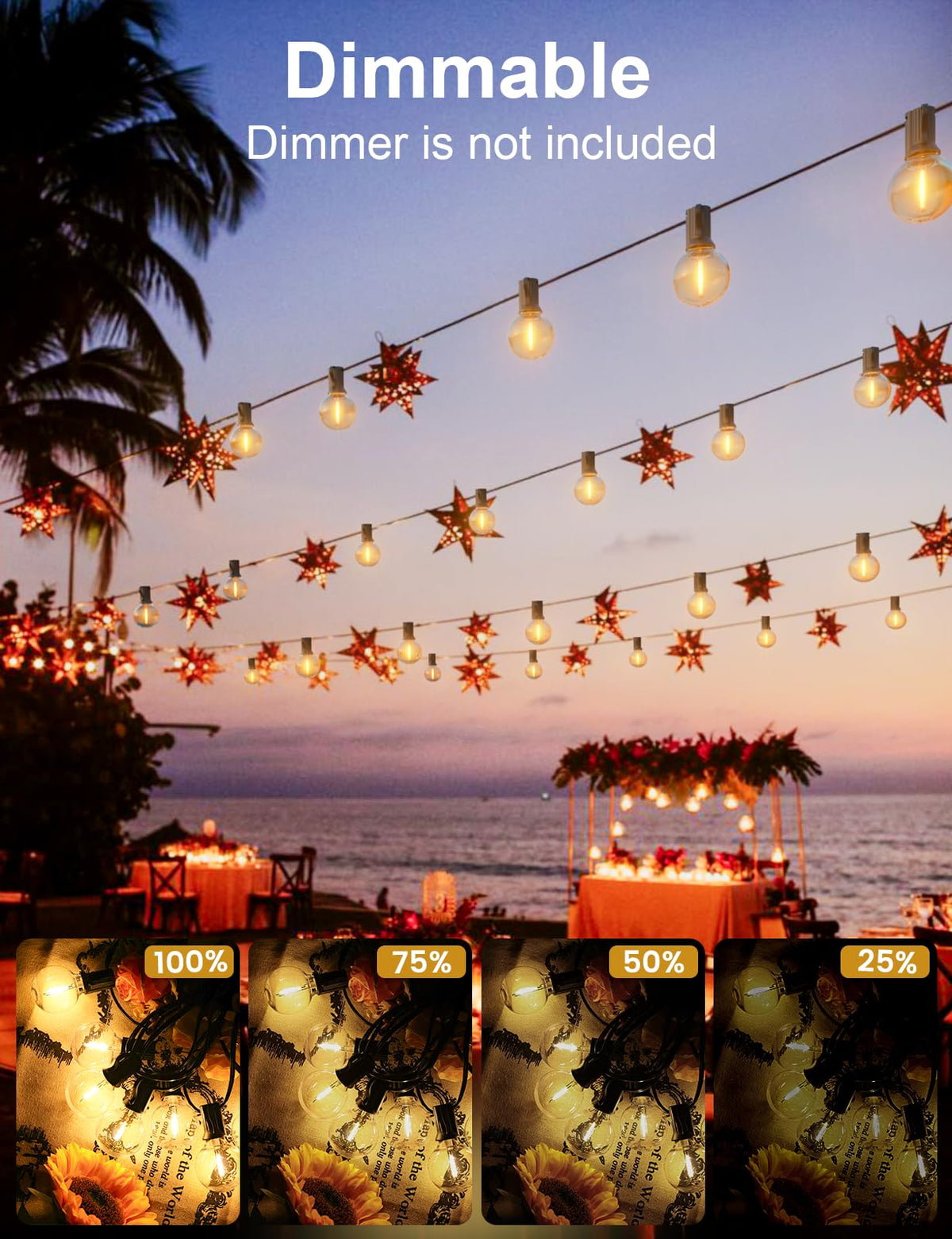 Q: Can these string lights be dimmed?A: Yes, the RTTY Outdoor String Lights are compatible with most dimmers (dimmer not included), allowing you to adjust the brightness for various occasions and create the perfect ambiance.
