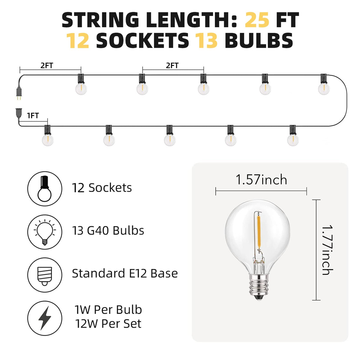 Rtty Outdoor String Lights 25 Ft, G40 Led Patio Globe Lights With 13Pcs Bulbs,Waterproof Shatterproof Dimmable Connectable Hangi