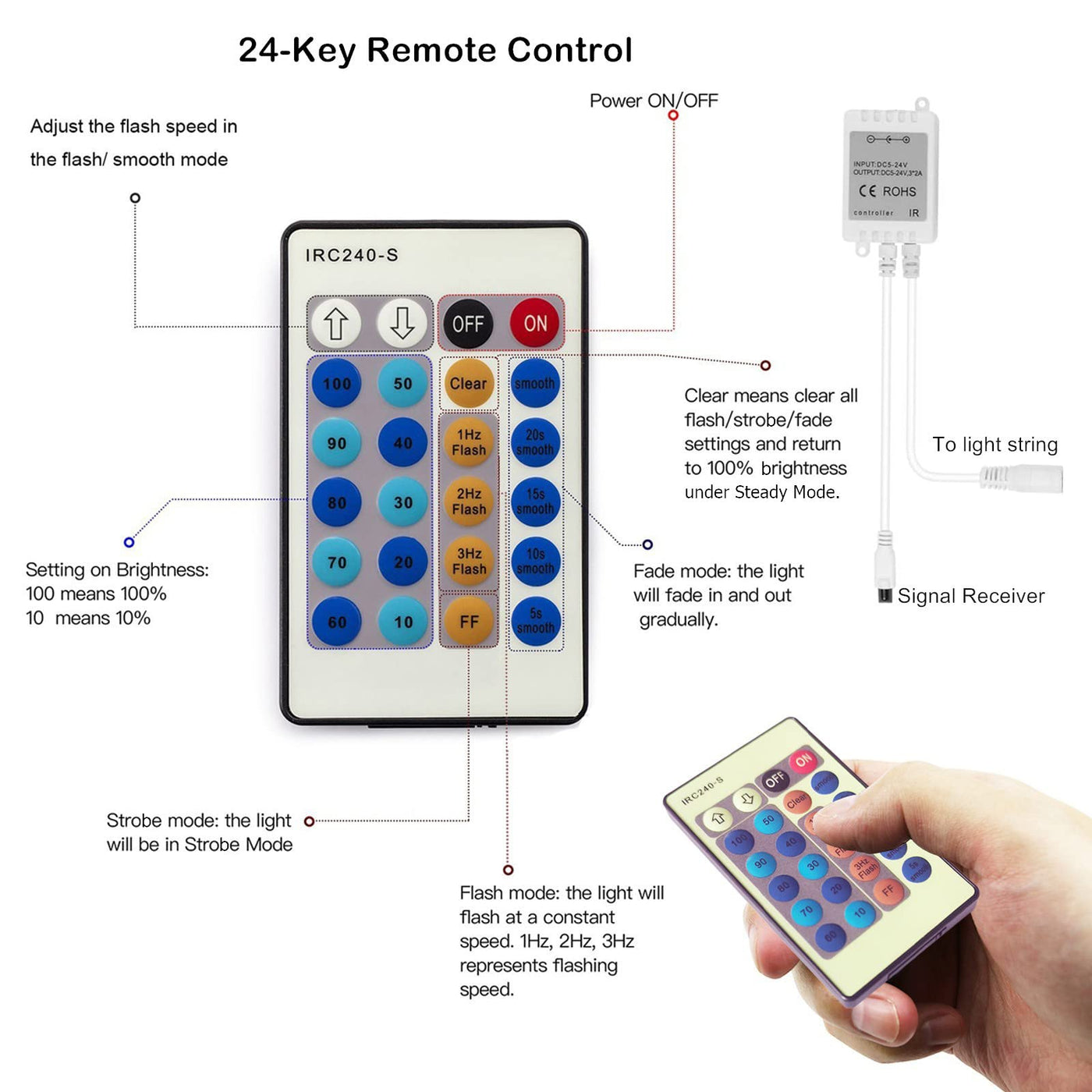- **Smart Remote Control**: Effortlessly manage your copper wire lights with a user-friendly remote, featuring 10 brightness levels and 3 dynamic modes—Smooth, Flash, and Strobe. Enjoy the convenience of controlling your lights from up to 20ft (6m) away.